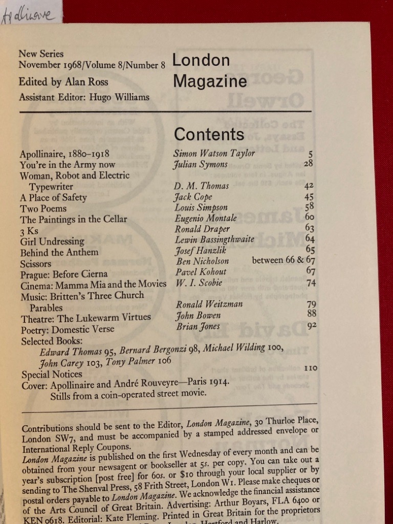 Description: for sale is the whole issue of this journal, brown card cover, a fresh copy, essay on Apollinaire with many illustrations, also includes Symons: You're in the Army Now, etc, well preserved, a few faint pencil marks