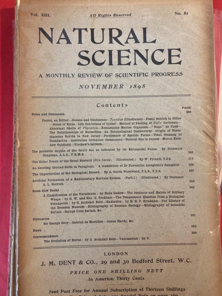 Description: 12p essay in "Natural Science", contains also News, Obituaries, New Books, Herrera on the Artificial Formation of a Rudimentary Nervous System, Woodward on the Imperfection of the Geological Record, Ground Sloth of Patagonia, Depth of the Gault Sea, etc, the entire issue approx 86p, grey paper cover, spine decayed, both covers detached, first edition