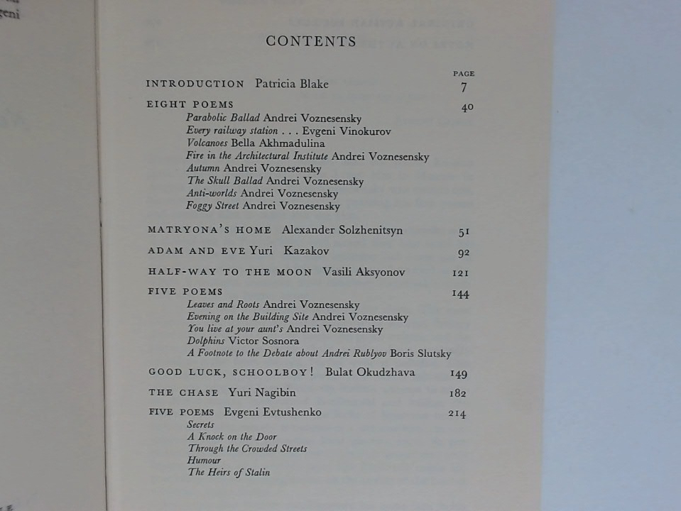Description: 276p midnight blue hardback, excellent condition, very well preserved first edition copy. Features Voznesensky, Solzhenitsyn Vinokurov and others.