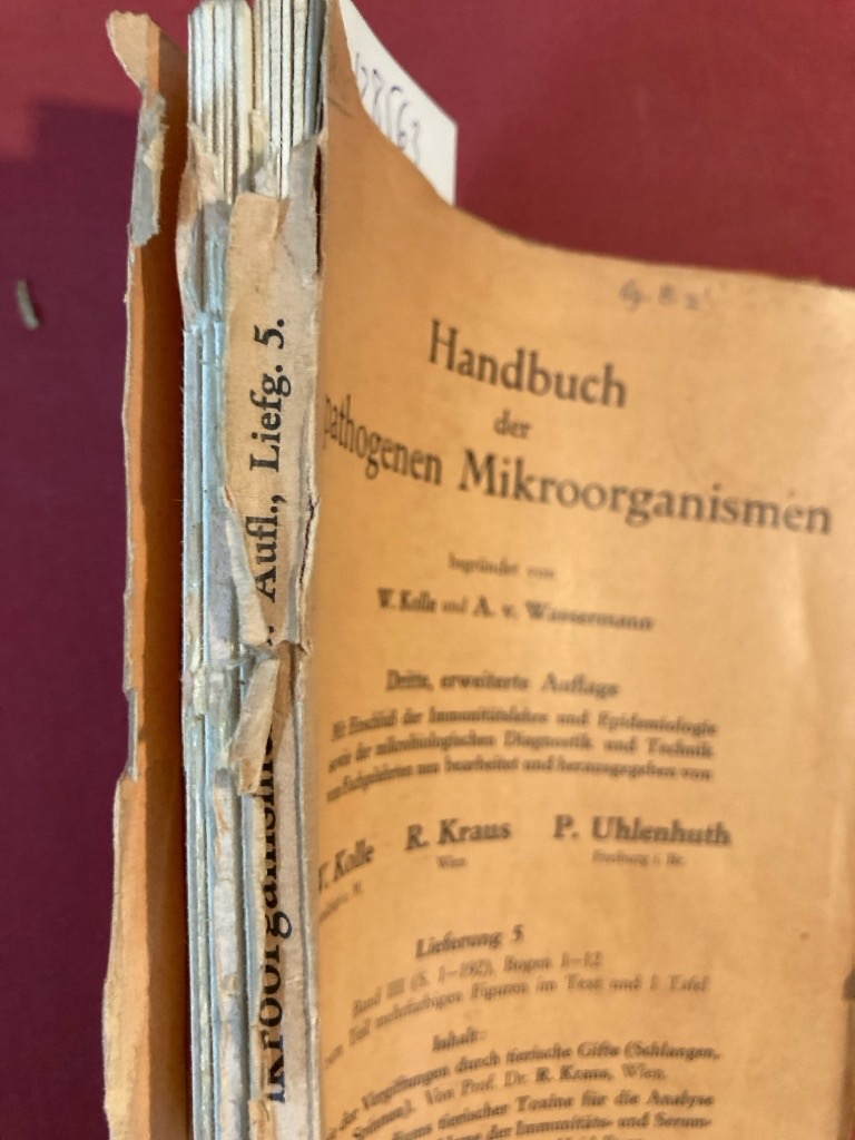 Description: paginated 1-92, orange paper cover worn, spine defective, text complete, light library markings, contains R Kraus, Serumtheraphie (Schlangen, Skorpione, Spinnen); Sachs (Tierische Toxine), Prausnitz (Heufieber, with colour plate), Jacoby (Pflanzliche Toxine), etc