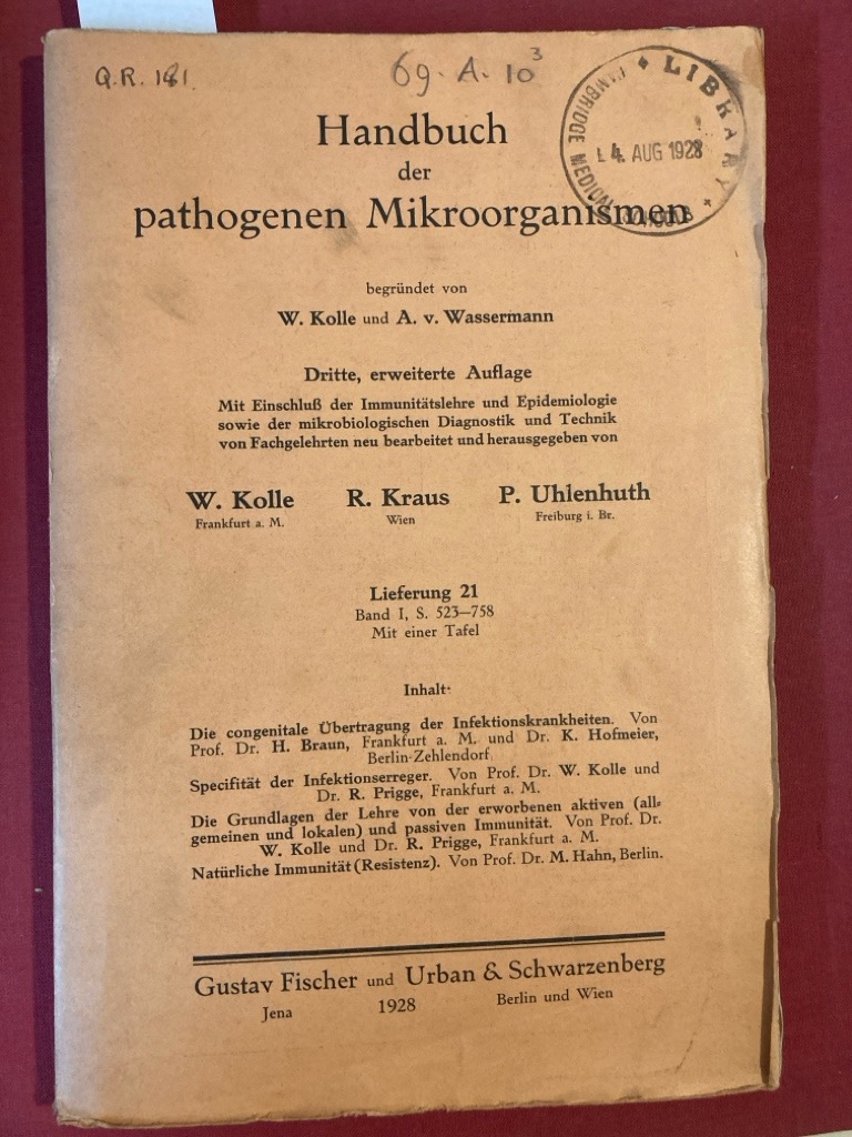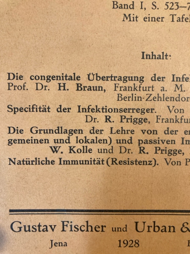 Description: large format paperback, orange paper cover well preserved, light library markings, paginated 523 - 758, contains Braun / Hofmeier: Congenitale Infektionskrankheiten; Kolle / Prigge: Spezifität der Infektionserreger; Aktive/ Passive Immunität; Hahn: Natürliche Immunität (Resistenz)