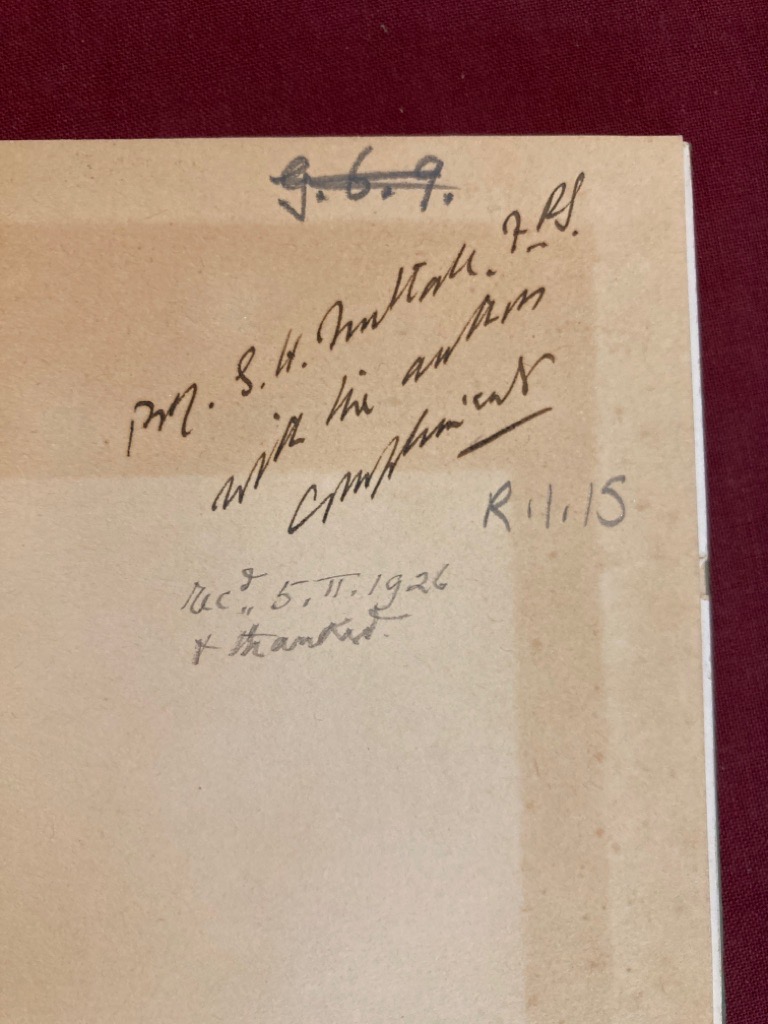 Description: 64p green hardcover with cloth spine, remains of library shelf labels on spine, 'Gift of Prof G H F Nuttall' bookplate to endpaper, one corner worn, first edition, in ink 'with the authors compliments' in a neat hand, frontispiece detached but present, plate, pages clean, binding firm, very good