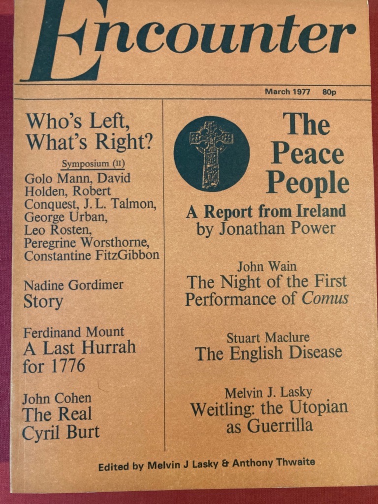 Description: for sale is a complete issue of Encounter for March 1977, contains also essays by Jonathan Power (Peace People in Ireland), John Wain (Comus), Stuart Maclure (The English Disease) etc