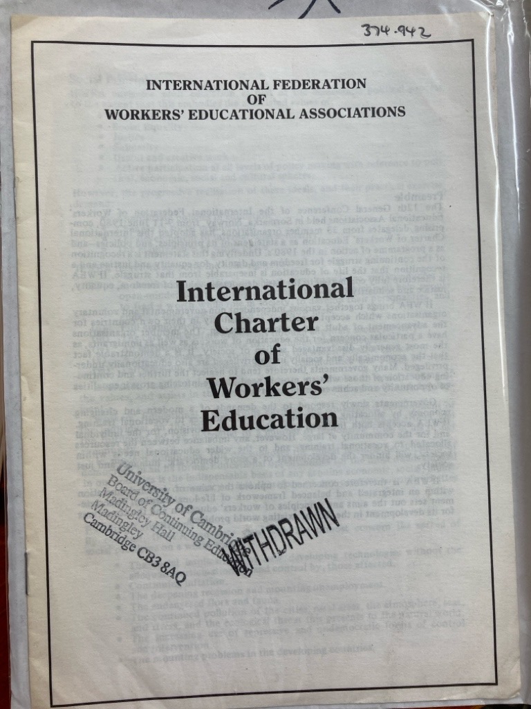 Description: 7p stapled pamphlet, International Charter of Workers' Education statement of principles and policies, from a Cambridge college library