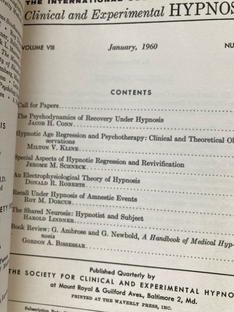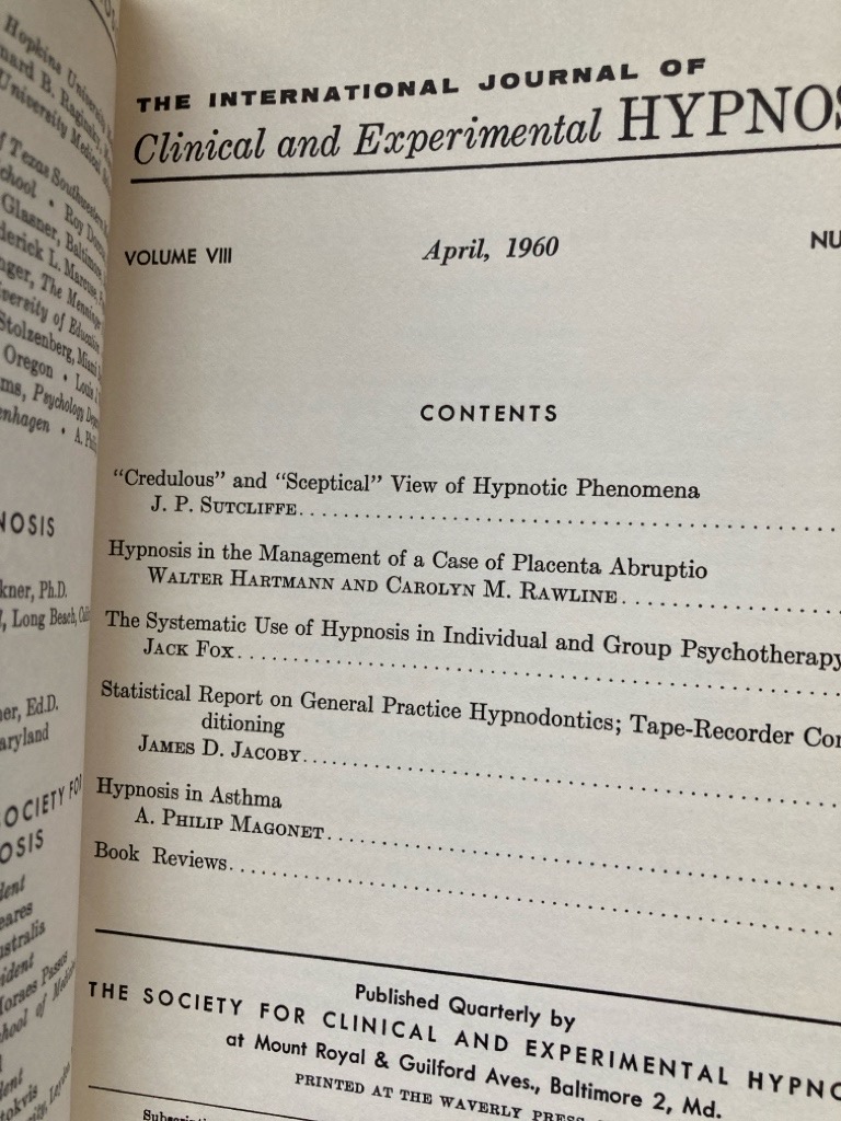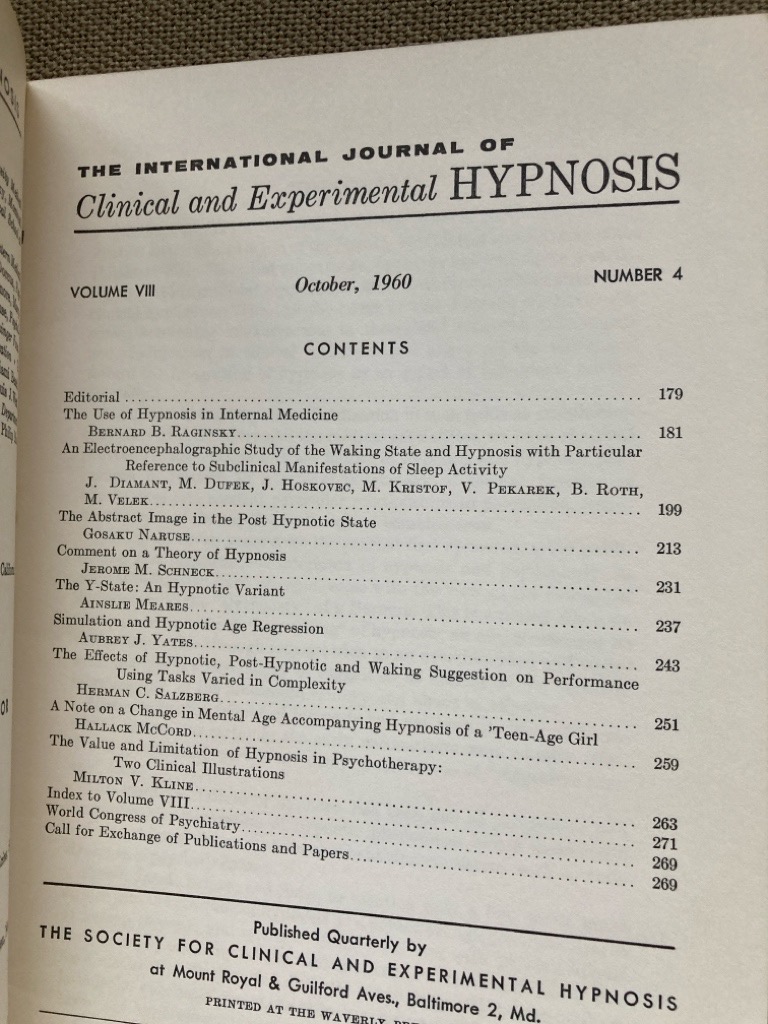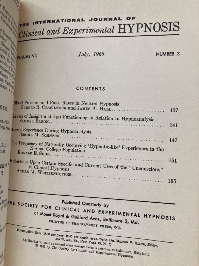 Publisher: Baltimore: Society for Clinical and Experimental Hypnosis 1960.