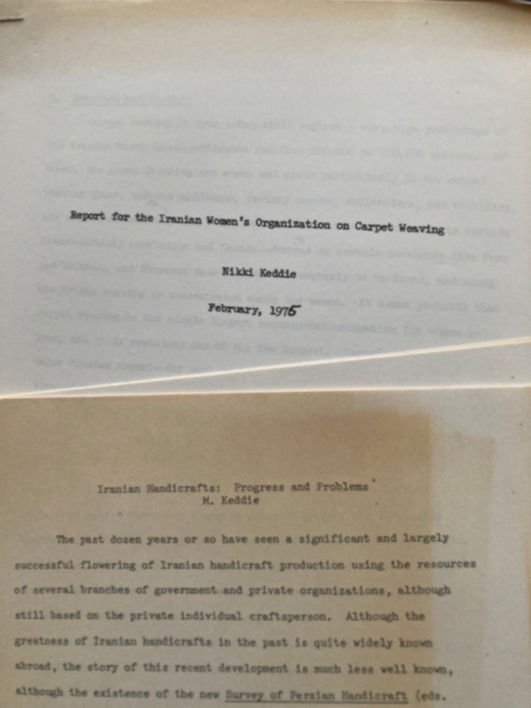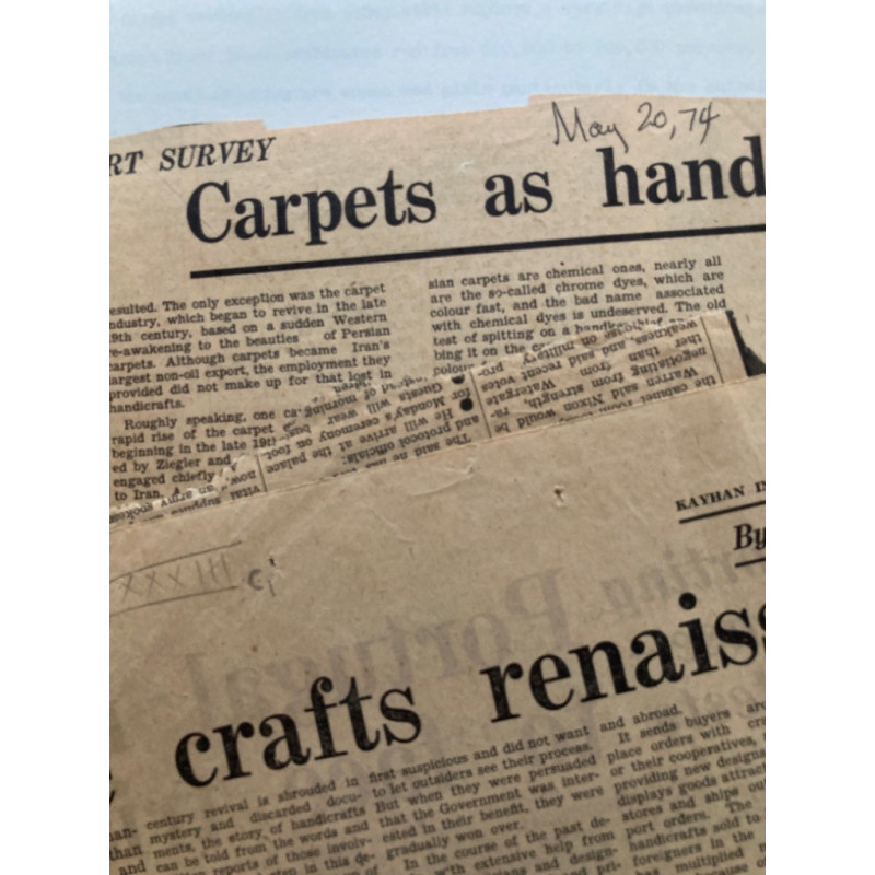 Description: theses are two stapled photocopies of typescripts, dated between 1974 and 1976, paginated to 26 and 15 pages, well preserved, they are entitled Report for the Iranian Women's Organization on Carpet Weaving; Iranian Handicrafts: Progress and Problems. Together with two (aged and fragile) newspaper clippings from Kayhan International (Tehran) with related essays by the same on carpet making, together housed in a Fedex envelope