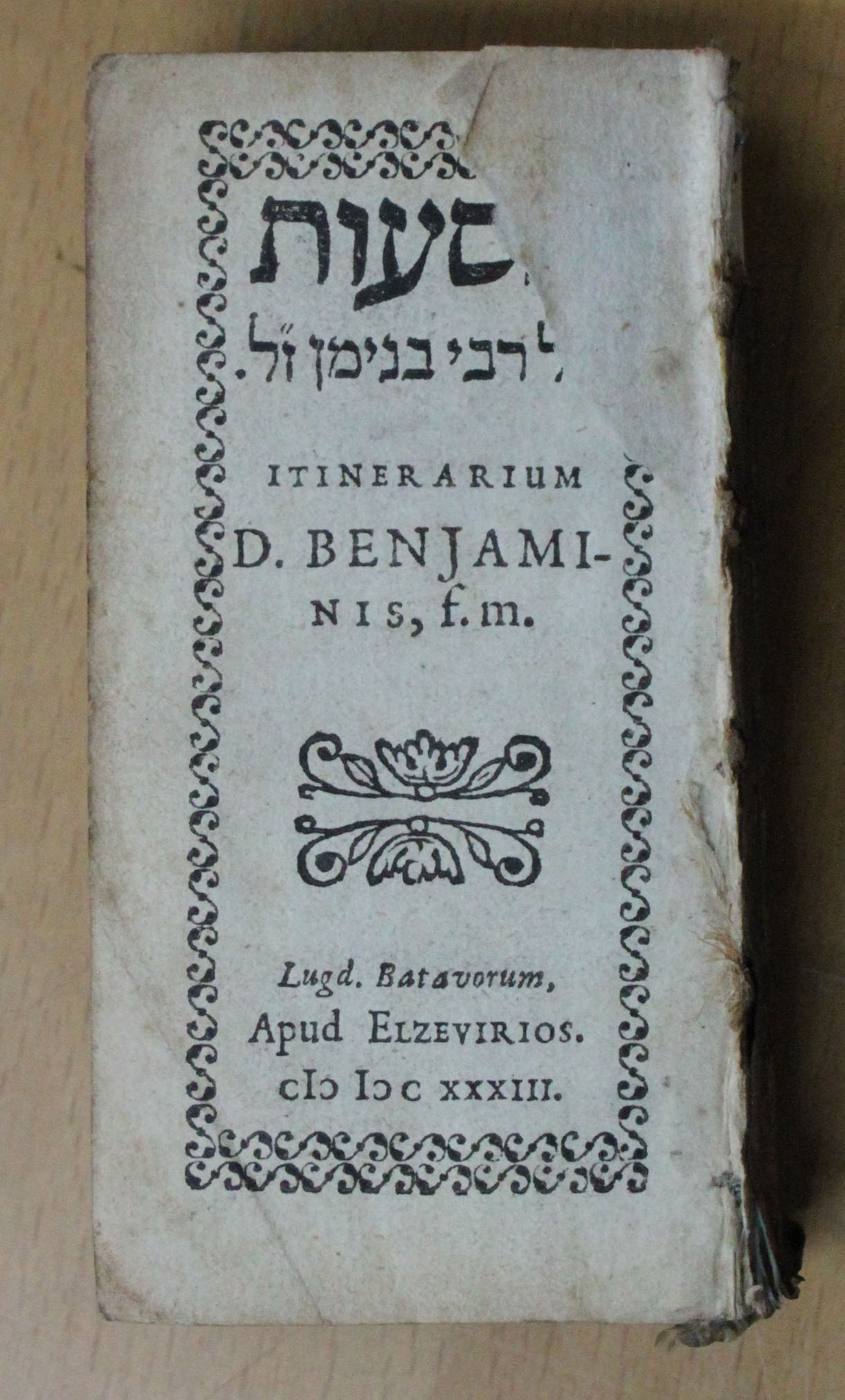 Description: This is a very small format volume, front board measures 95 millimeter high and 50 mm wide, uniform with the famous Elzevier format, Willems # 379, old full calf, both boards detached and one compartment of spine missing, old gilt lettering to spine "Itiner Benjam," all edges gilt with faint traces of gauffering, old library bookplate with withdrawn stamp to one board, no stamps to either Latin or Hebrew title, small piece missing from Latin title, Latin text followed by Hebrew text paginated from the end, book composed of "Ad lectorem" without pagination, 233p, index, Hebrew text collates to i[6]. Binding tight, first edition, this volume is awaiting expert repair but is also available in the unrepaired condition, to allow the new owner to conduct repairs to their own specifications. Very rare title in the collectible format