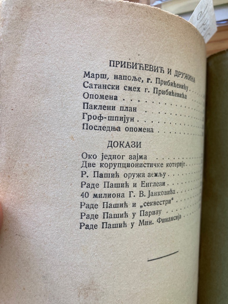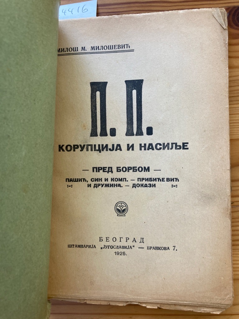 Description: 124p iv, original paperback, dark green paper cover lettered MMM PP, Serbian language, Cyrillic type, text clean, binding tight, no names or stamps, back cover with old large white paper label lettered "Belgrade 1925" the purpose of which seems to be to cover up print under it. The title translated Corruption and Violence, the text deals with the affairs of Rade Pasic, son of the Nikola Pašic, the Serbian and Yugoslav politician and diplomat who was a leading political figure for almost 40 years. Scarce title in excellent condition
