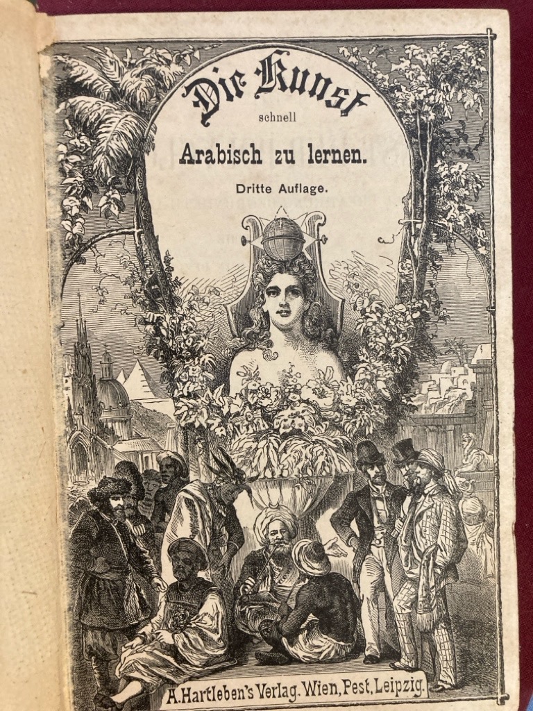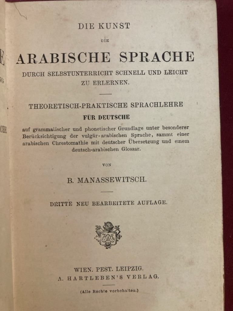 Description: 186p green cloth, illustrated boards a little worn, illustrated title page, folded calendar (?) sheet inserted, notes to back, binding holding, still very good condition, in German and Arabic, third edition