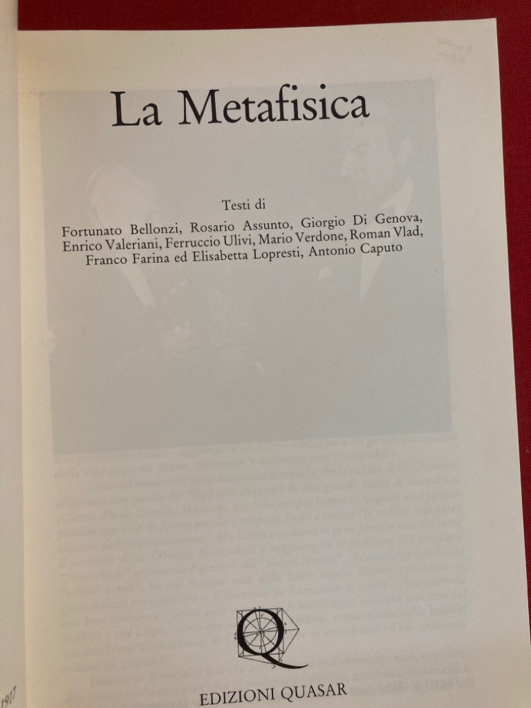 Description: 164p paperback with colour cover (Ettore e Andromaca), contains many b/w plates throughout, some bibliographical records for this title refer to it as "mostra didattica itinerante organizzata dalla Quadriennale Nazionale d'arte di Roma per incarico del Ministero Italiano degli Affari Esteri in collaborazione col Museo Documentario della Metafisica di Ferrara", but the copy at hand here does not allow us to verify this information, but it seems likely this description is somehow attached to the book we have at hand, even if we can not see it (ISBN: 8885020348)