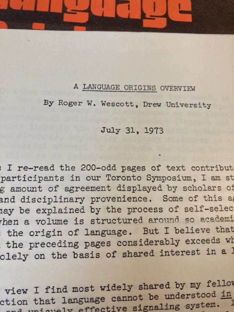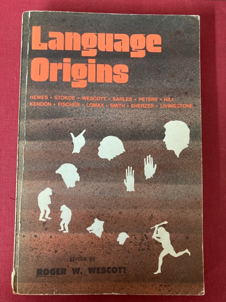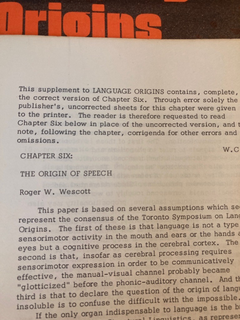 Description: 297p paperback with illustrated cover, light wear to edges, laid in as a supplement is a complete, corrected version of Chapter Six due to the publisher's error in prematurely passing the uncorrected sheets to the printer, also a 4 page typescript entitled 'A Language Origins Overview' dated July 31 1973, Drew University: Wescott's account of the contributions of the 14 participants in the Toronto Symposium