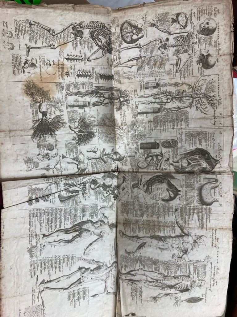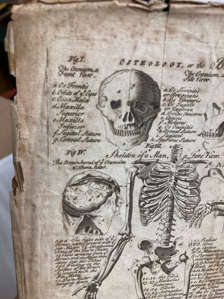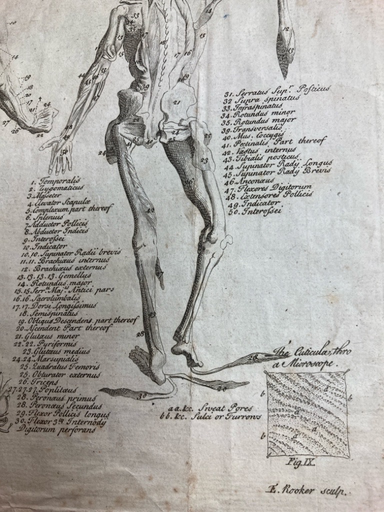 Description: This is a large engraved plate approx 40 x 60 cm, entitled "Tab: Anatomy" and signed "E Rooker sculp" (= Edward Rooker). Divided in four columns (Osteology / Angeiology or the Vessels, Splancnology or the Viscera / Myology or the Muscles