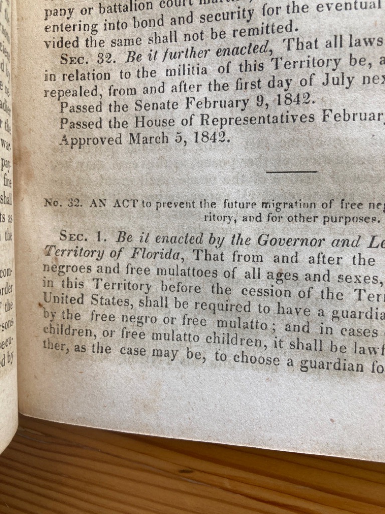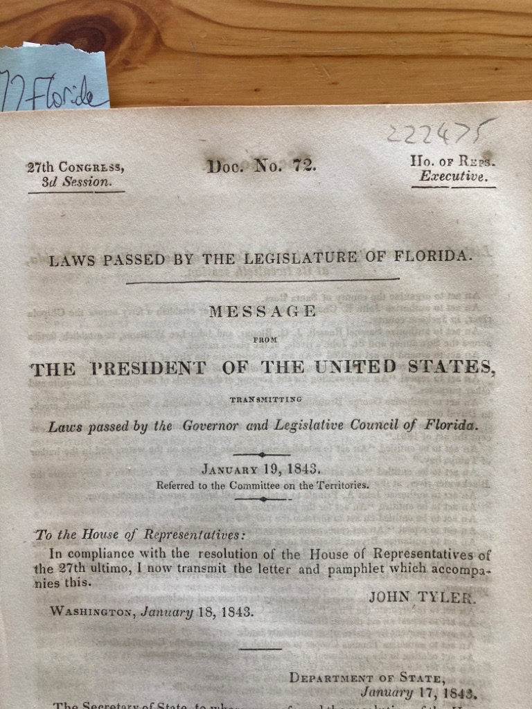 Description: This is Document No 72 from US House of Representatives, 27th Congress, 3rd Session, House of Representatives, Executive, 52p, removed from binding, original print, item can be easily housed in a new cover, spine holding, well preserved, contains text of early Florida laws, including Act to prevent the future migration of free negroes or mulattoes in the Territory, trespassing on university land, much about ferries and bridges, unlawful to sell any slave, free negro, or mulatto any spirituous or intoxicating liquors (No 17), includes index