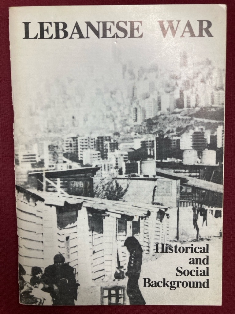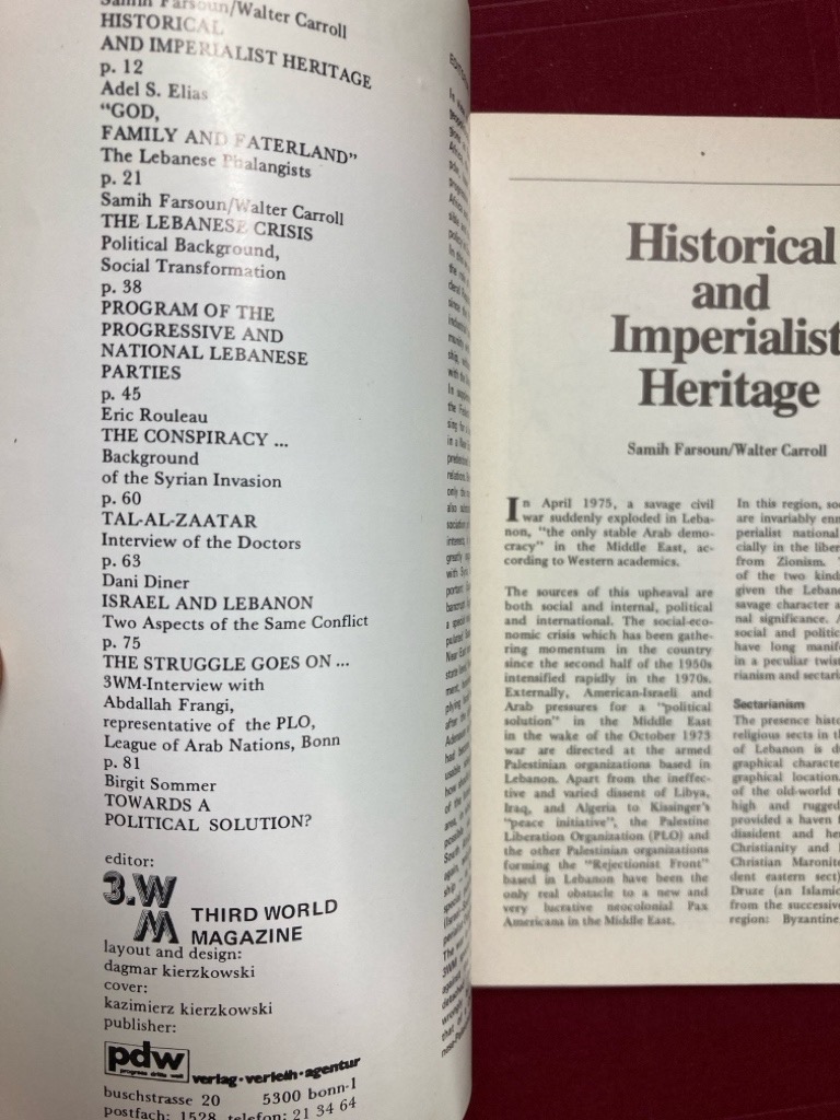Description: 96p stapled booklet, illustrated cover, illustrations, essays by Samih Farsoun, Walter Carroll, Adel Elias, Eric Rouleau, Dani Diner, Birgit Sommer, Interview with Abdallah Frangi, etc