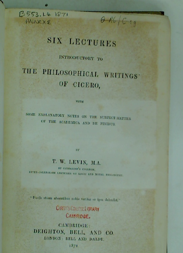 Six Lectures Introductory to the Philosophical Writings of Cicero.