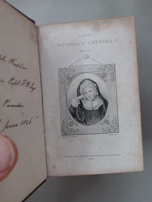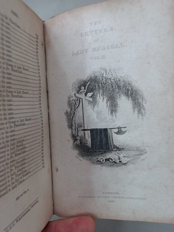 Description: two parts in one volume, 168p 144p engraved title pages, the first showing her ladyship in a picture frame is dated 1819, the second involving eagle and serpent and an altar dressed with a black cloth (?), engraved title pages a little dusty, full green calf binding nice and tight with nice spine label, excellent volume, small format 14cm, very good, apparently issued as volume 6 of British Prose Writers