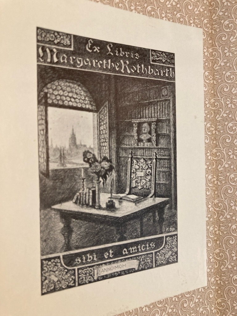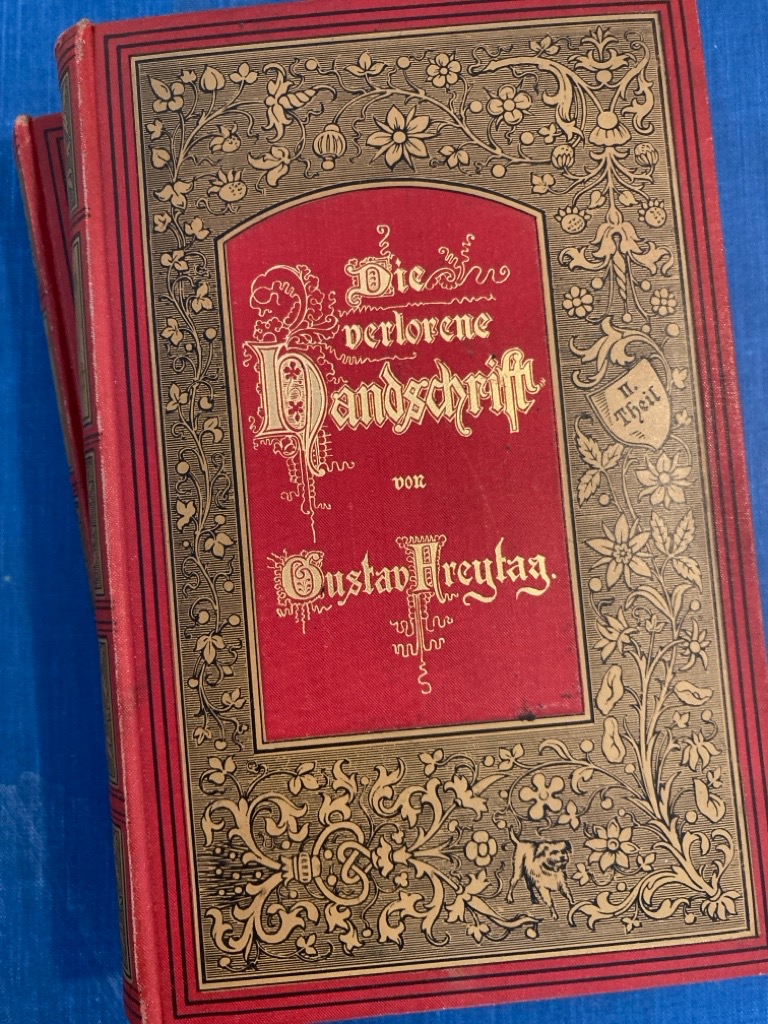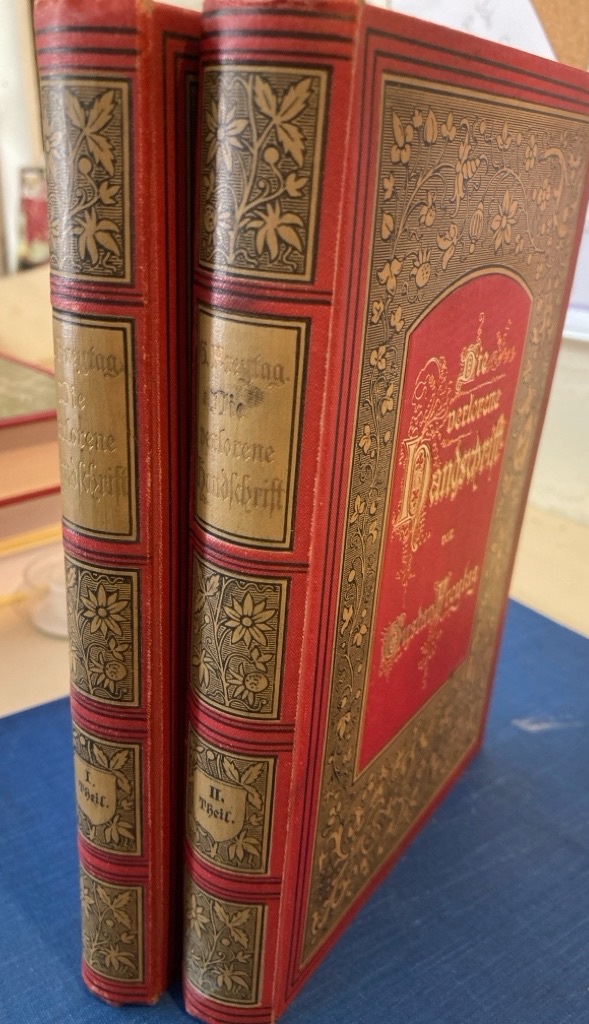 Description: We have here Gustave Freytag Die Verlorene Handschrift from 1901, in a striking and bright binding, each volume with the ex libris of Margarethe Rothbarth, showing a study with an open window giving a view of the Frankfurt Cathedral