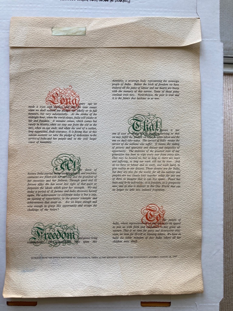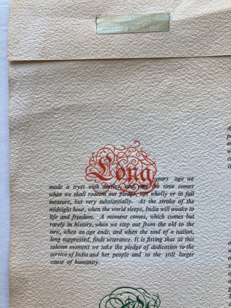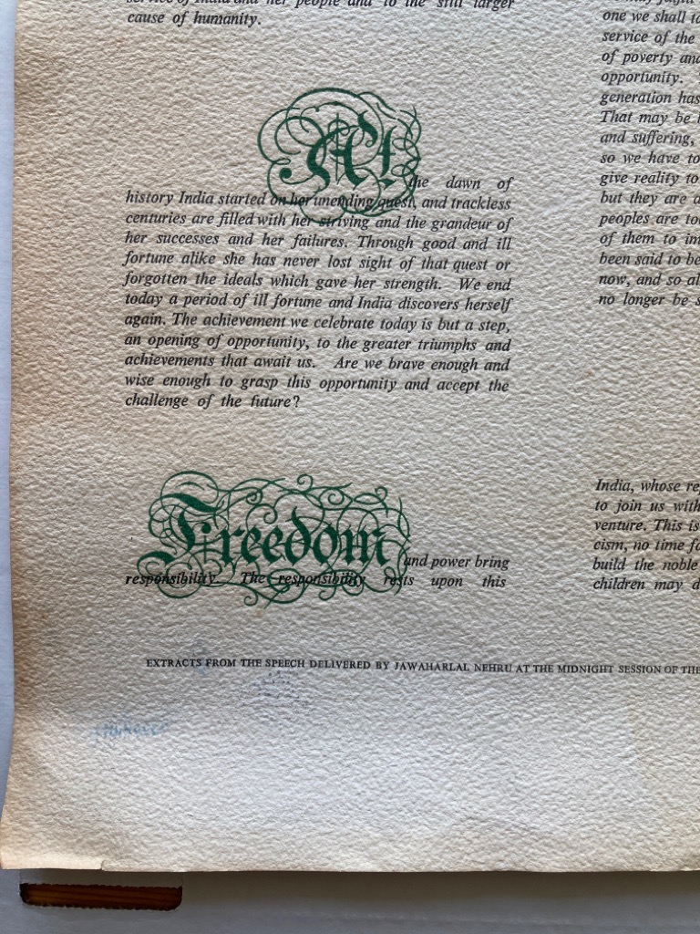 Description: This is a single sheet, broadside, folded at top with green ribbon, presenting extracts of the famous speech in 5 paragraphs, with oversized initial words printed in colour and heavily ornamented, original printed letterpress, italic type, coarse paper, not creased but slight signs of age, at bottom: Extracts from the Speech Delivered by Jawaharlal Nehru at the Midnight Session of the Constituent Assembly, August 14, 1947. No imprint given