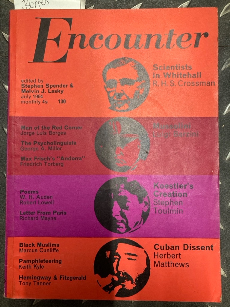 Description: Borges contribution in Encounter, for sale is the complete issue, contains also essays by Barzini (Mussolini), Toulmin (Koestler), Poems by Auden, etc