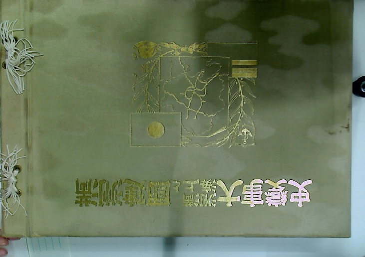 Description: 213 paginated leaves, oversized oblong album, hardback bound in silk with gilt lettering, silk a little worn at edges but still intact, binding tight, contains many illustrations of the military campaign in China, illustrated throughout, captions to illustrations in English and Japanese, well preserved, a few pages seem to have come detached