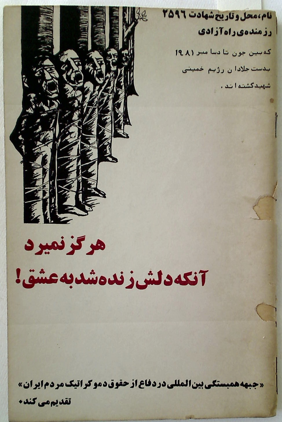 Description: 80p stapled booklet, cover fragile but holding, with illustrations, issued by the International Solidarity Front for the Defense of Iranian People Democratic Rights, paper yellowing, partly Farsi text