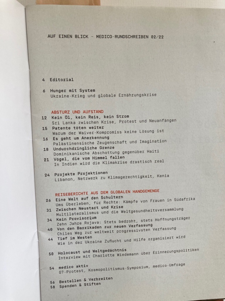 Description: 54p stapled booklet, colour cover, well produced and incisive language, edited by Katja Maurer: Sri Lanka - Klein Öl, kein Reis, kein Strom; Patente töten weiter; Palästinensische Zeugenschaft und Imagination; Domenikanische Abschottung gegenüber Haiti; Indien: Vögel die vom Himmel Fallen, etc
