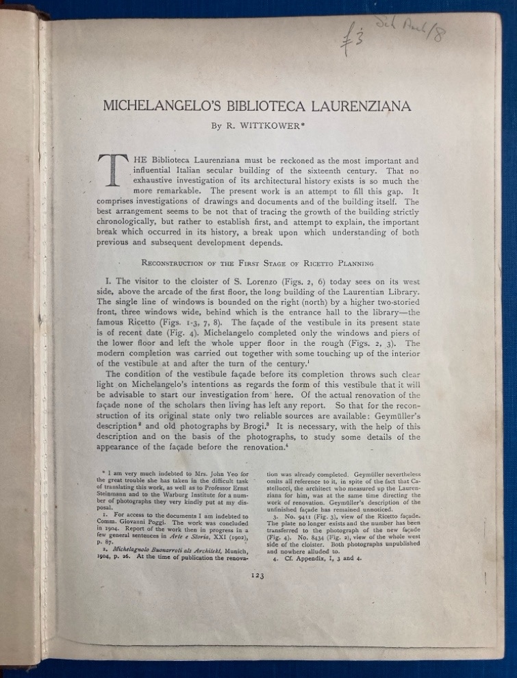 Description: 123p - 218p (96 pages) large format journal offprint (The Art Bulletin, Volume 16, No. 2, Published by CAA), tan dustjacket with title handwritten on spine, brown boards with spine covered with black tape, binding broken between page 204 and 205, damp and discolouration towards rear of the book, Cambridge University Arts Faculty Library ex-libris, light library markings in pencil, rare and one of a kind, very good condition