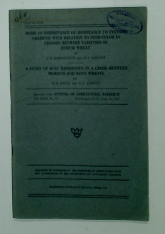 Description: 50p offprint from the Journal of Agricultural Research, with plates and tables, contains also a second publication (Cross between Marquis and Kota Wheats), nice and clean copy with library stamp to cover