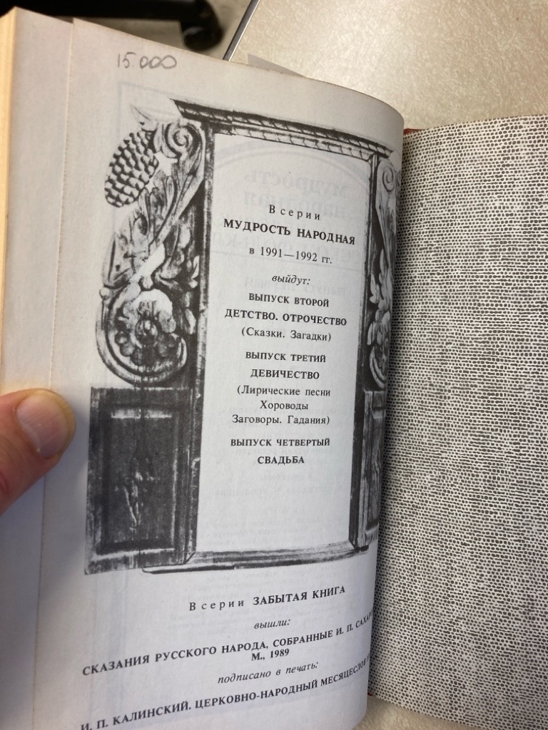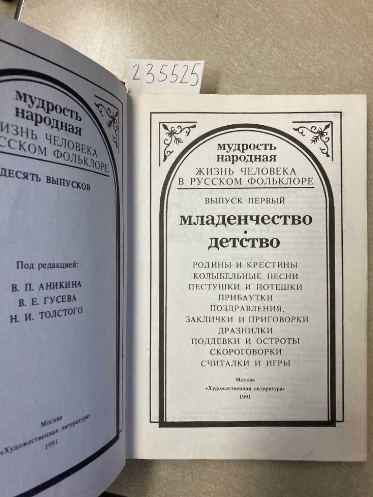 Description: 590p terracotta cloth, gilt lettering, thick volume, solid binding, includes many color illustrations, very good condition: The first installment of the Folk Wisdom series (childhood folklore). Partly based on the P V Shein collection. Encyclopedic coverage of lullabies, nursery rhymes, jokes, congratulations, chants, sayings, teasers, jokes and witticisms, tongue twisters, counting rhymes, games, etc (ISBN: 5280010227)