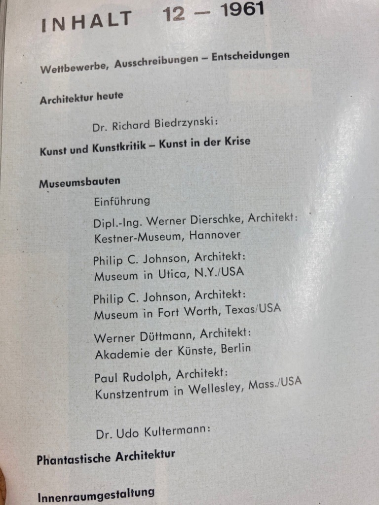 Description: large format paperback journal, taller than A4, includes much period advertisement, essays on museum architecture by Gerhard Schwab, Werner Dierschke, Philip Johnson (2x), Werner Düttmann, Raul Rudolph, etc