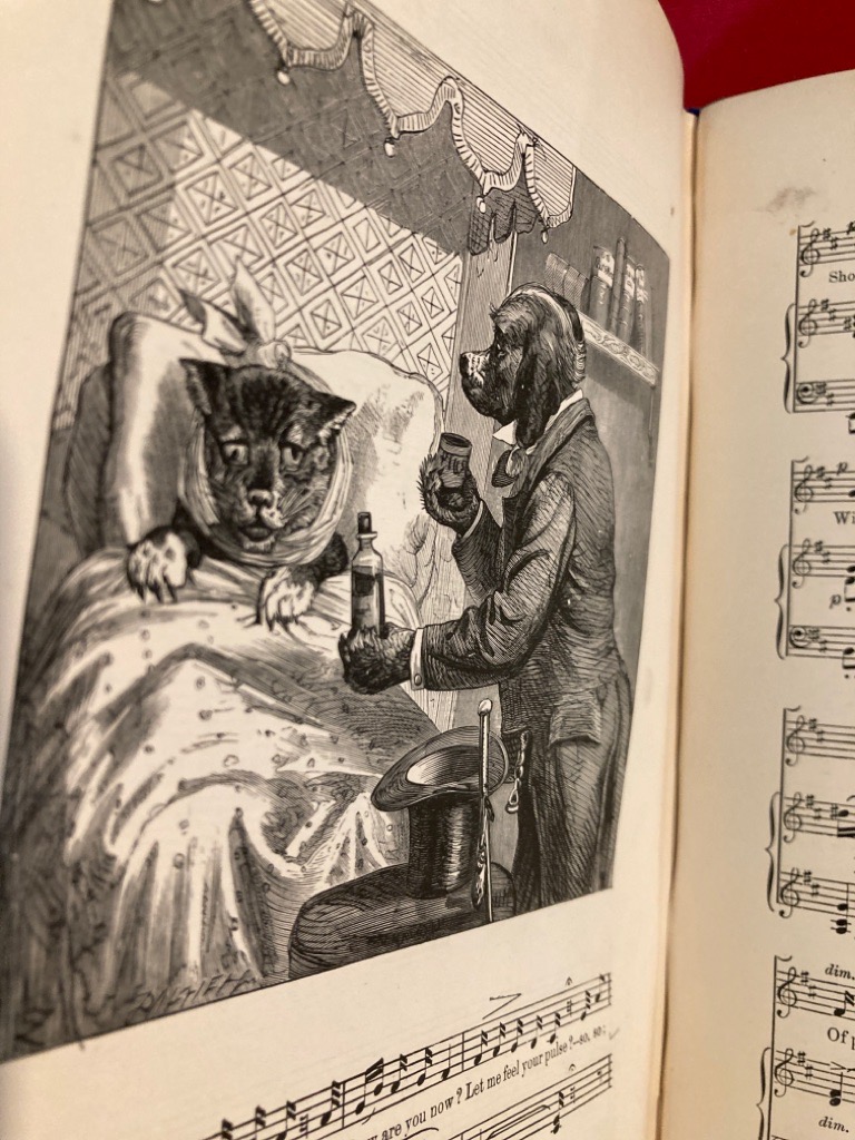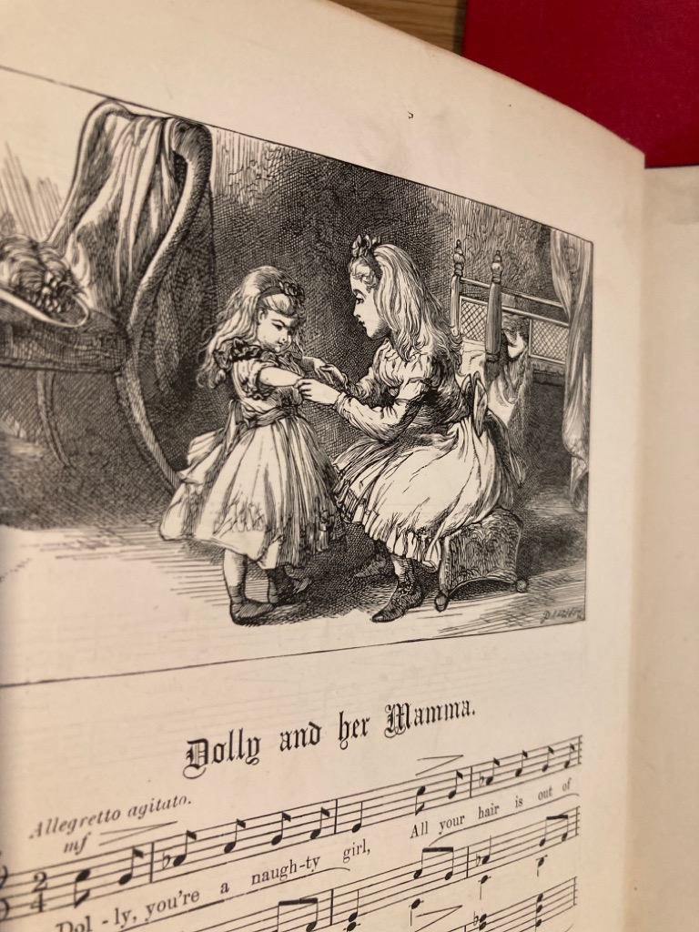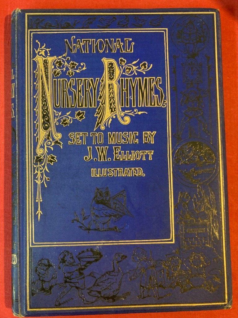 Description: 111p large format hardback, bright Prussian blue cloth with gilt and black highlights, bevelled boards, endpapers not cracked, all edges gilt, print of musical notation can be felt when running finger over the page, no year of publication, a very attractive copy, likely a first edition?