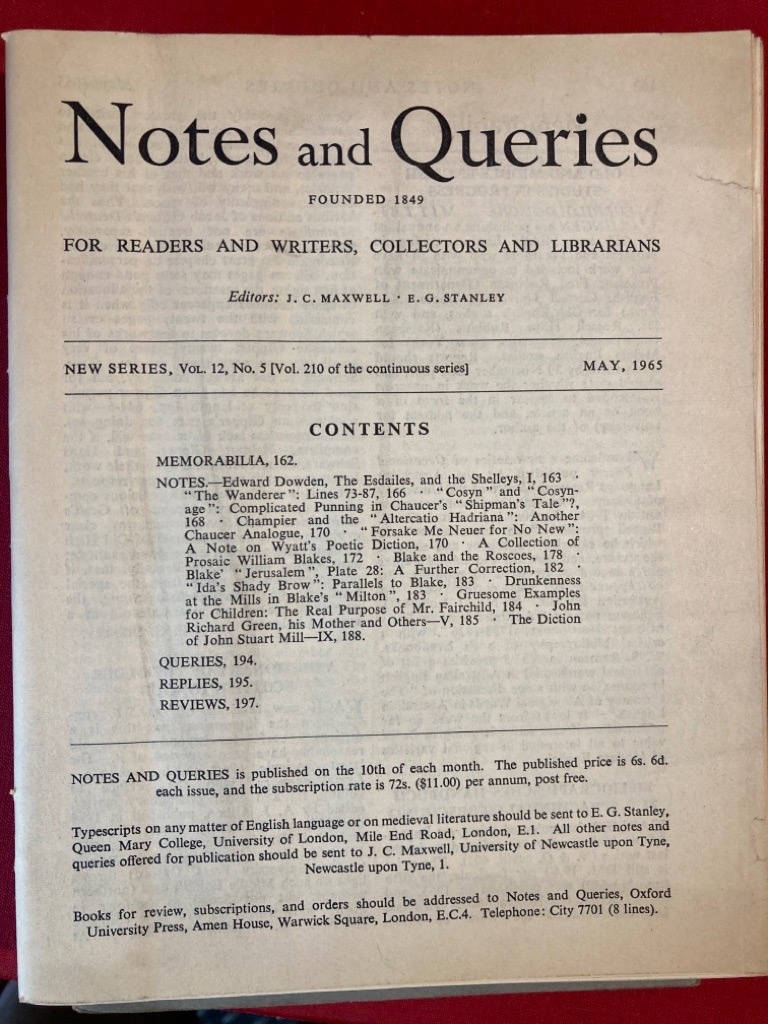 Notes and Queries for Readers and Writers, Collectors and Librarians; May 1965.