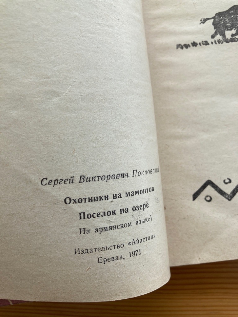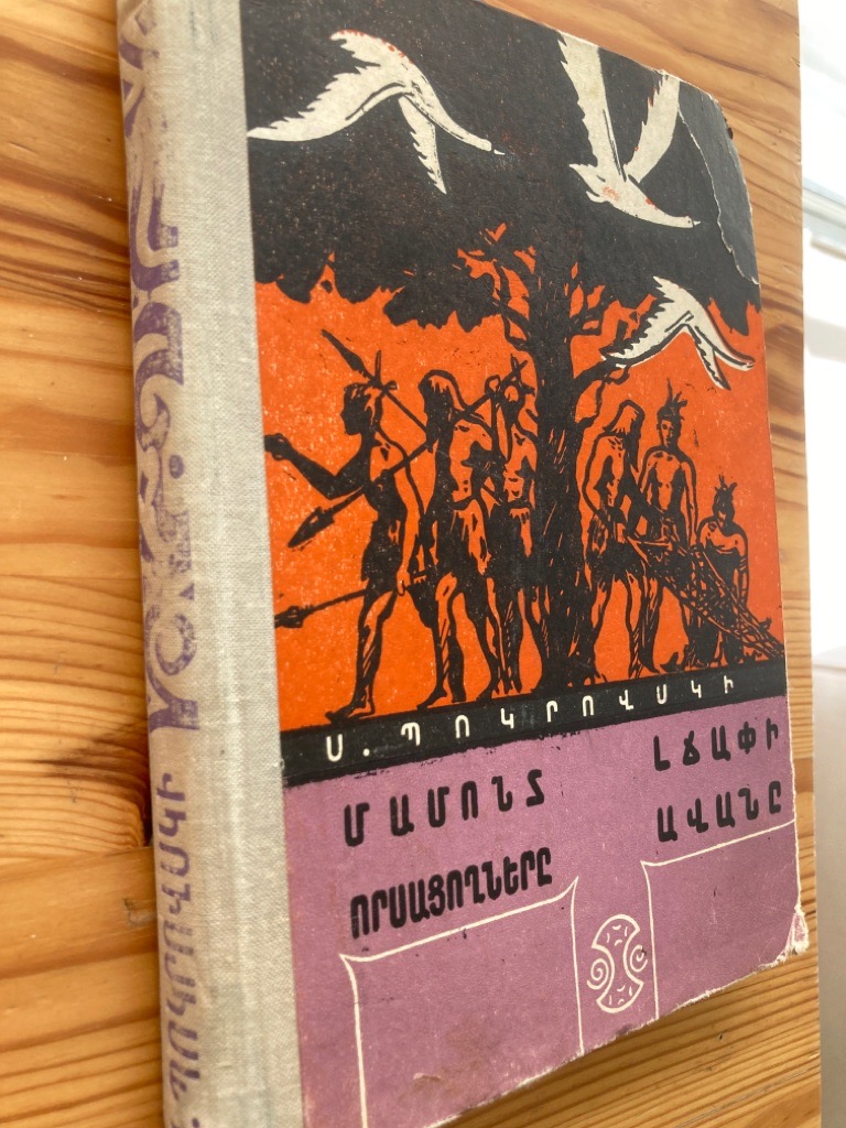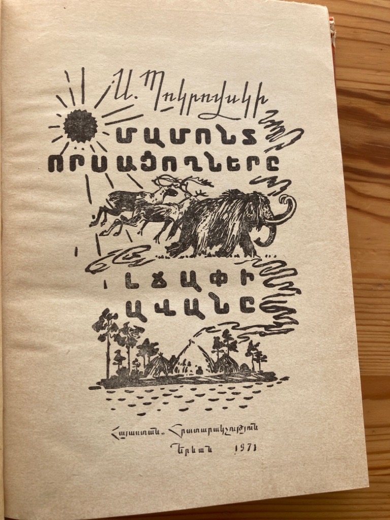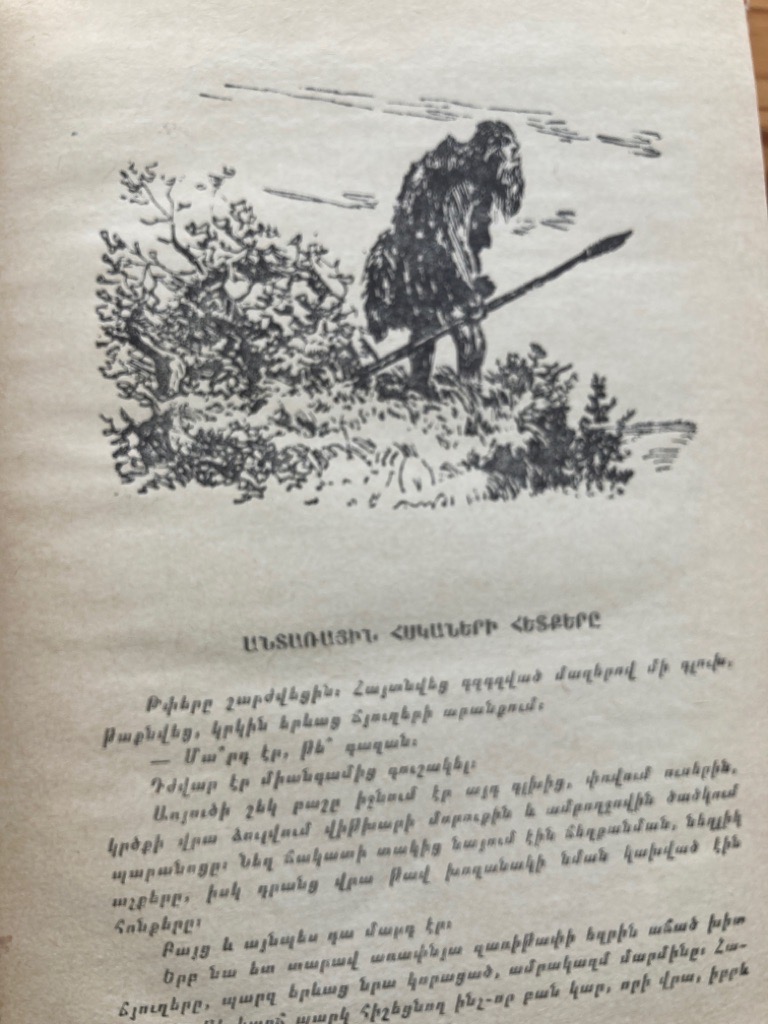 Description: 324p hardback with illustrated boards, cloth spine, text with illustrations, well preserved, light crease to front board, we can not locate this Armenian translation in worldcat, stories about Mammoth hunters; Village on the Lake