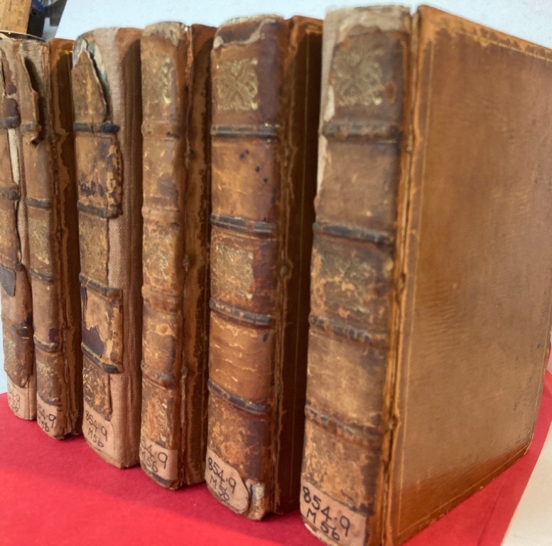 Description: set of 6 volumes, approx 500p each, small full leather, spines and boards with wear and fragile, head of spines torn, some hinges effectively repaired with cloth, old library markings to spine, marbled edges and endpapers, portrait frontispiece in volume 1, title with a different vignette for each volume, pages clean, Girton College bookplate College stamp to back of title page crossed out, weak inner hinges, binding firm, a complete set, first edition, in search of a new home