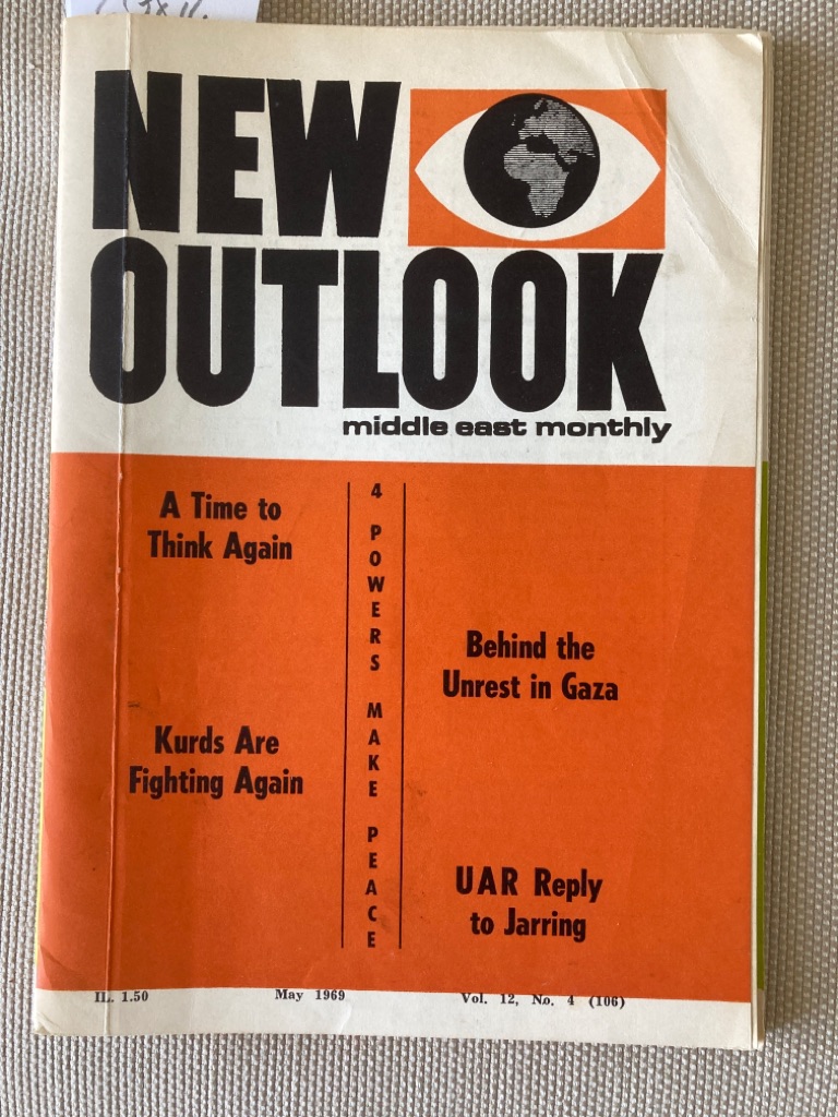 Description: 64p stapled magazine with orange cover, a fresh and clean copy, very good indeed, crease to cover: Simha Flapan: A Time to Think Again; Mordehai Nahumi: Great Powers Make Peace; Warren Young: Soviet Aid and the Progressive Arab States; Yosef Nevo: How many Palestinians?; Gershon Salomon: The Kurds are Fighting again; Alexander Aviram: Behind the Unrest in Gaza; etc