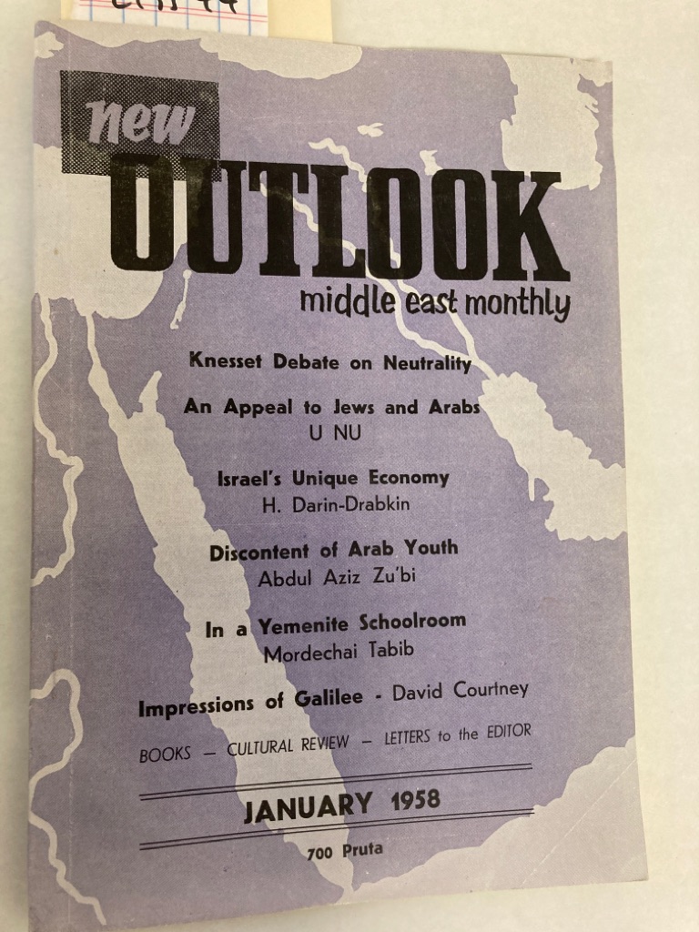 Description: 64p magazine with purple cover, fresh and clean copy, very good indeed: Knesset Debate on Neutrality, Israel's Unique Economy (H Darin-Drabkin), Discontent of Arab Youth (Abdul Aziz Zu'bi), A Yemenite Schoolroom (Mordechai Tabib), Impressions of Galilee (David Courtney), etc