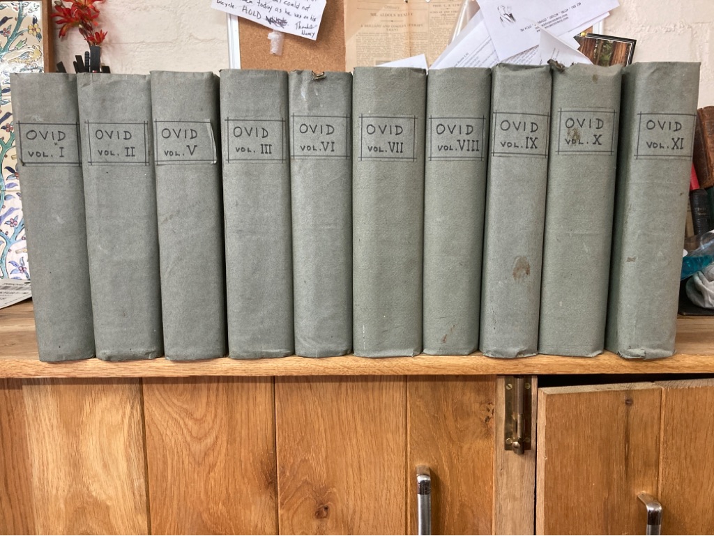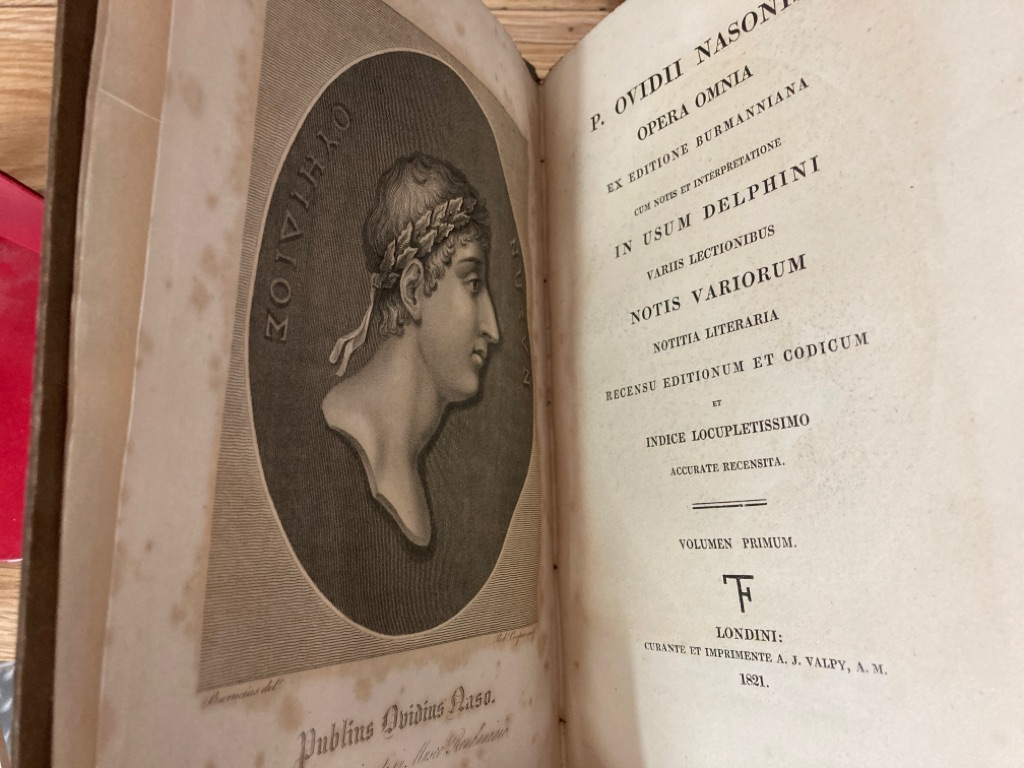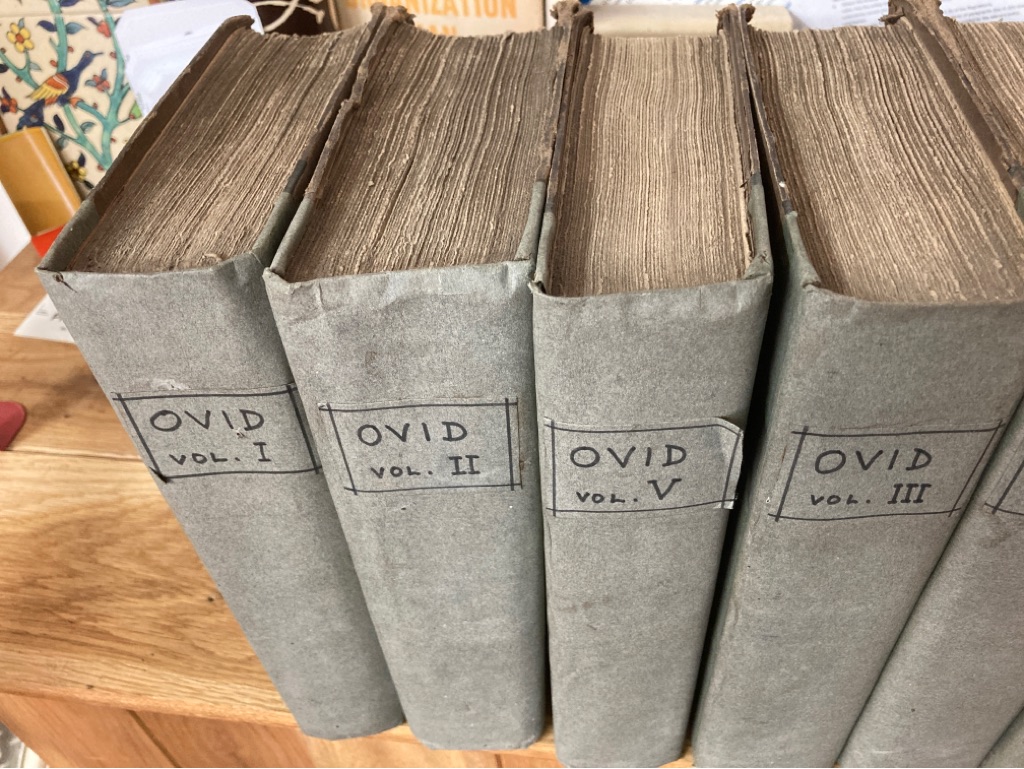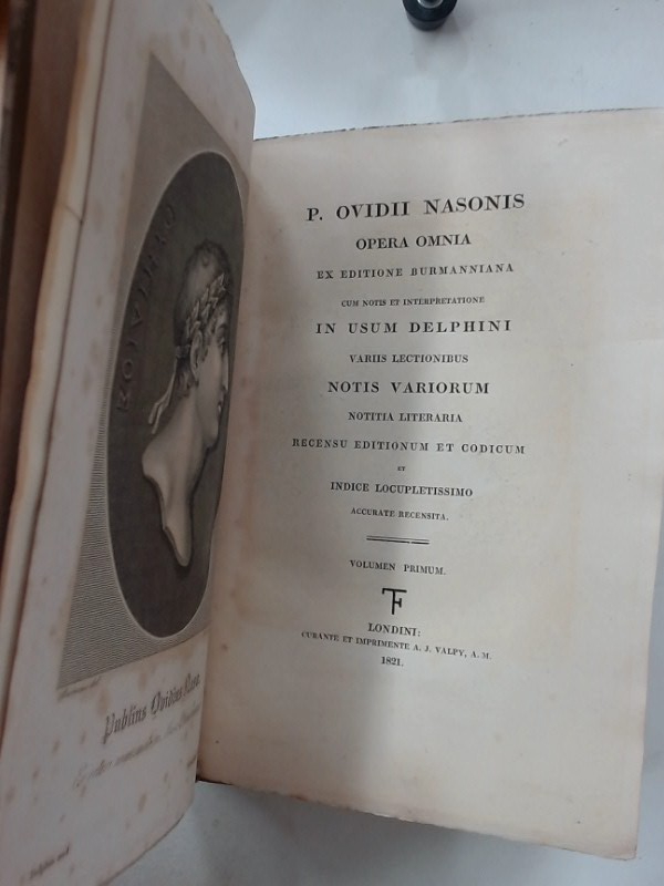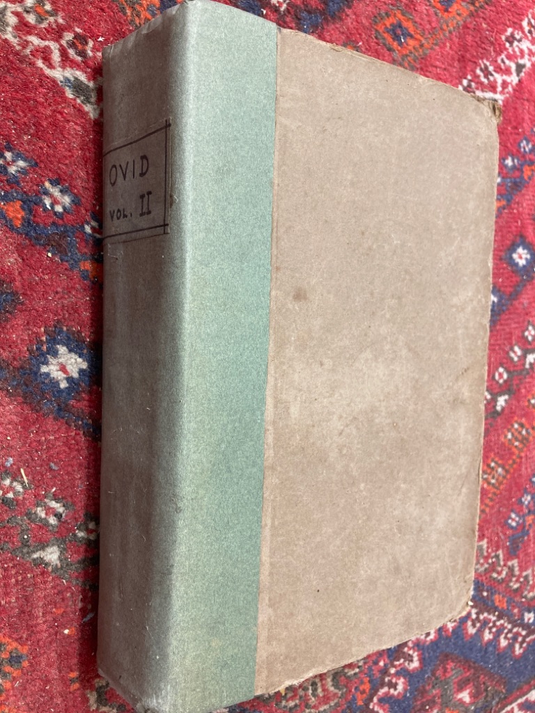 Description: Incomplete set of 10 (of 11) volumes, missing Volume 4, paginated continuously to 3848p over the first 8 volumes, followed by two index volumes, paginated in Roman numerals to, wait for it, 999 (recte DCCCCXCIX), bound in original(?) plain paper covered boards grey, spines recently supported with fitting plain paper structure and volume label, all bindings tight, engraved frontispiece to the first volume, large format edition, spine height 25cm, paper clean and fresh even if initial pages show light foxing, a well preserved set. To estimate the loss of Volume 4 we add that Volume 3 is paginated to page 1480 (Metamorph XI) and that Volume 5 starts with Fastorum Lib 3 on page 1937.