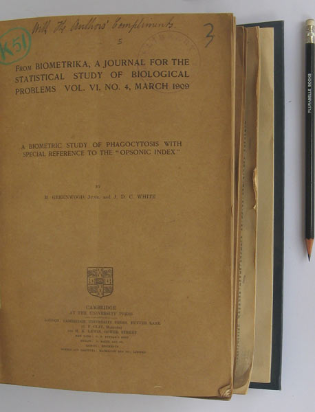 Description: approx 400p blue library cloth with gilt lettering and tiny shelf label to spine, custom binding, collection of 44 papers from varying sources bound together, some reprints from journals, separate pagination, pages varying in size, typed contents page bound in, b&w plates, papers dated approx 1909 - 1931, hand-rwitten 'with the author's compliments' on 2 offprints, also includes The Fertility of the English Middle Classes; Statistical Aspects of the problem of Human Nutrition, Industrial Hygiene, etc, very good copy from a Cambridge college library