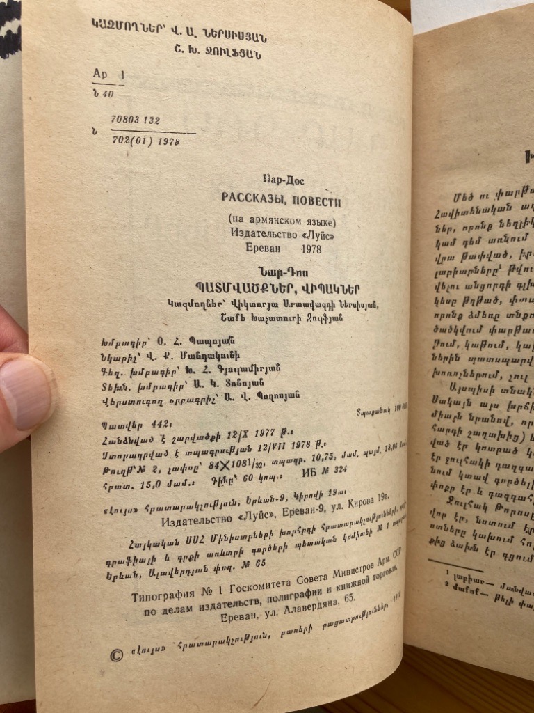 Description: 344p hardback, paper covered boards with brown illustration, cloth spine, edges a little rubbed, spine bright, a well preserved copy, light crease to front board, Nar-Dos is the pen name of Michael Hovhannisyan