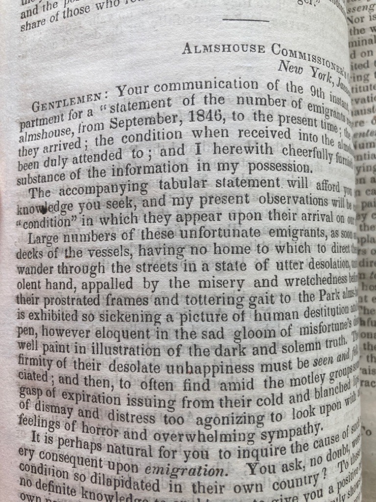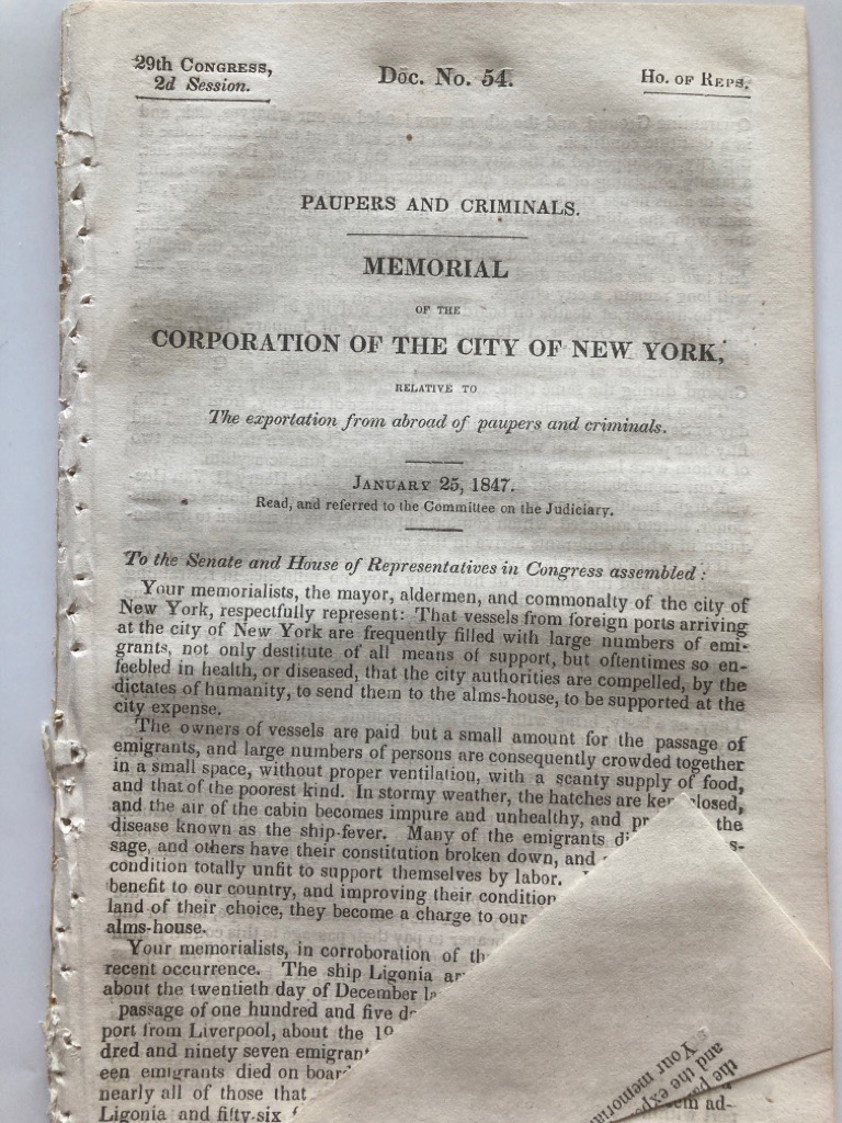 Description: 21p removed from binding, original print, binding still holding, a slim item, without cover, first page creased, this item could easily be inserted in a new binding, = 29th Congress, 2nd Session, House of Representatives, Document 54, a clean copy: Name, Country, Vessel, Harbor, Date, Almshouse: much information about the Gross-Zimmern municipal emigration where the poor of the town (600+) become return trip load for the tobacco trade, and overwhelm the charitable institutions on New York: M G Leonard has some choice words for the desolation that knocks at his door, includes the names of the paupers and names of boats they arrived in.