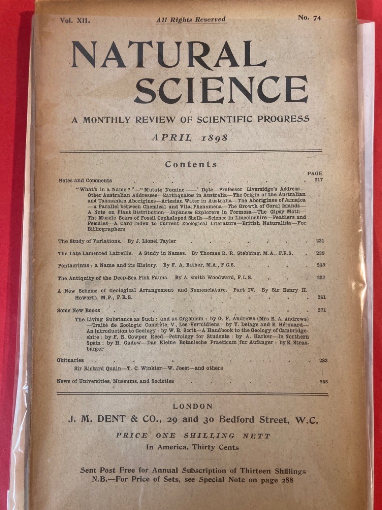 Description: 12p essay in "Natural Science", contains also lively Notes and Comments, News, Obituaries, New Books, this issue contains also A Study of Variations by Lionel Tayler, The Late Lamented Latreille- A Study in Names, (T Stebbing), Antiquity of Deep See Fish Fauna (A Smith Woodward), A New Scheme of Geological Arrangement and Nomenclature (Howorth), the entire issue approx 86p, focus on scientific nomenclature, grey paper cover, first edition, well preserved, spine firm