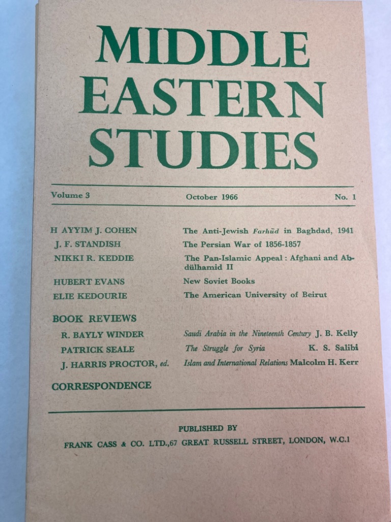 Description: this is a 30p essay in Middle Eastern Studies, for sale is the entire issue, approx 120p, light card cover with green lettering, as a bonus it also contains an essay by Nikki Keddie (Afghani and Abdulhamid II) and one by Elie Kedourie on the American University of Beirut