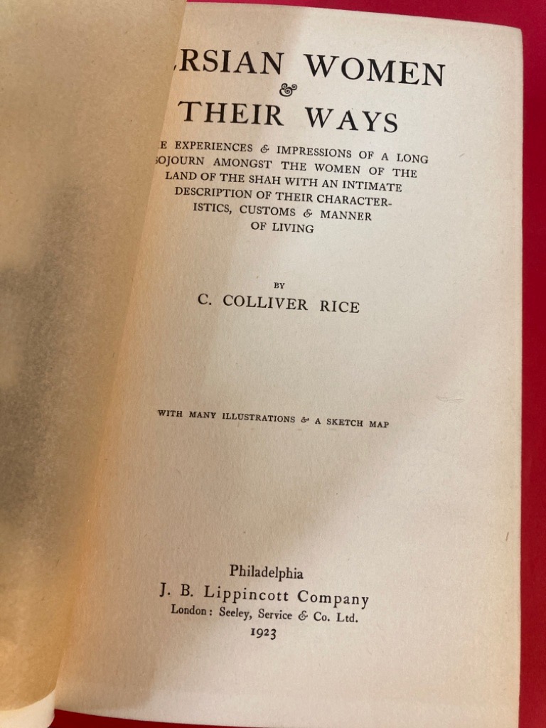 Description: 322p original grey cloth with lion design to front board, binding holding well, a little used copy, fresh, frontispiece with tissue-guard, addtl plates, without names or stamps, but trace of plain paper shelfmark to spine, a few pages with marginal lines or minor annotations (in ink, not more than a half a dozen pages affected), a respectable copy of a rare title: The experiences & impressions of a long sojourn amongst the women of the land of the Shah with an intimate description of their characteristics, customs & manner of living