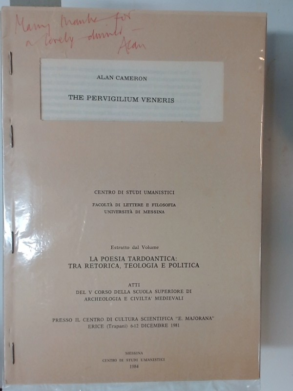 Description: 25p offprint, beige card cover with window, clean and tight, "Many thanks for a lovely dinner", very good, together with a second offprint by the same: "The last days of the Academy at Athens" (1969)