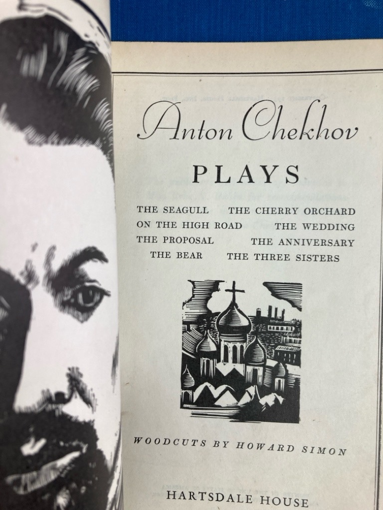 Description: 328p red cloth with black and white dots design, spine a little sunned, striking frontispiece and addtl woodcut illustrations. includes Seagull, Cherry Orchard, On the High Road, The Wedding, The Proposal, The Anniversary, The Bear, The Three Sisters. Text clean, binding firm, bookplate from the Cambridge Theatre Group, requesting immediate return of the volume