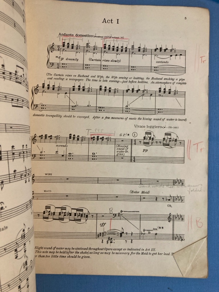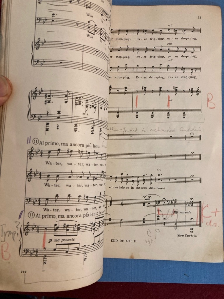 Description: 60p A4 format, grey card cover, spine fragile, text complete, quite a few passages with annotations and correction in red pencil consistent with use as a conductor's copy: "I was going to have a bath, a lovely bath!" / "Hark the water stops / My knowledge and skill are worth more than your mops." A well used copy with additional hints for a (much desired) performance