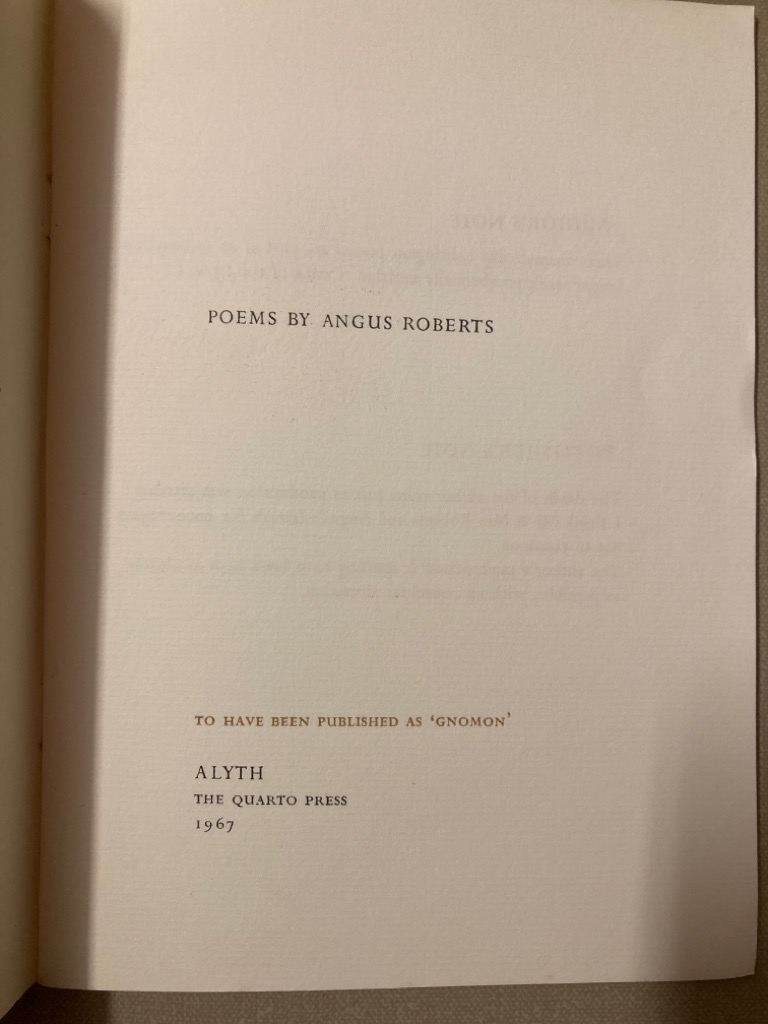 Description: 20p slim stapled volume, grey card cover, number 50 of a limited edition of 150, handset in Perpetua 12 Point, Glastonbury Antique laid paper, illustrations silkscreen and letterpress by J B Easson, well preserved though staples are rusty