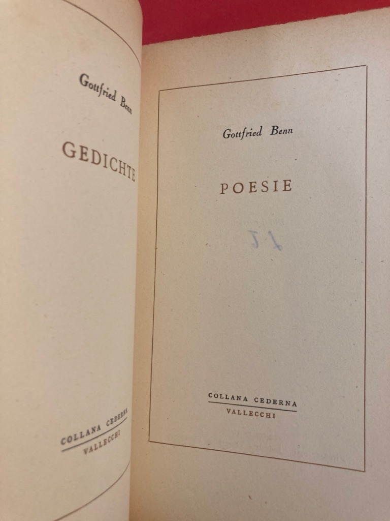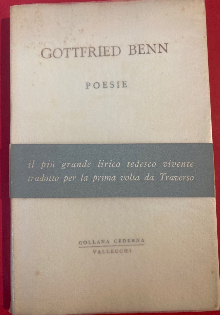 Description: 129p large paperback, white cover, glassine jacket present, edited and translated by Leone Traverso, German and Italian text on facing pages, a very good copy with band around cover "il piu grande lirico tedesco tradotto per la prima volta da Traverso", also "scheda bibliografica" inserted