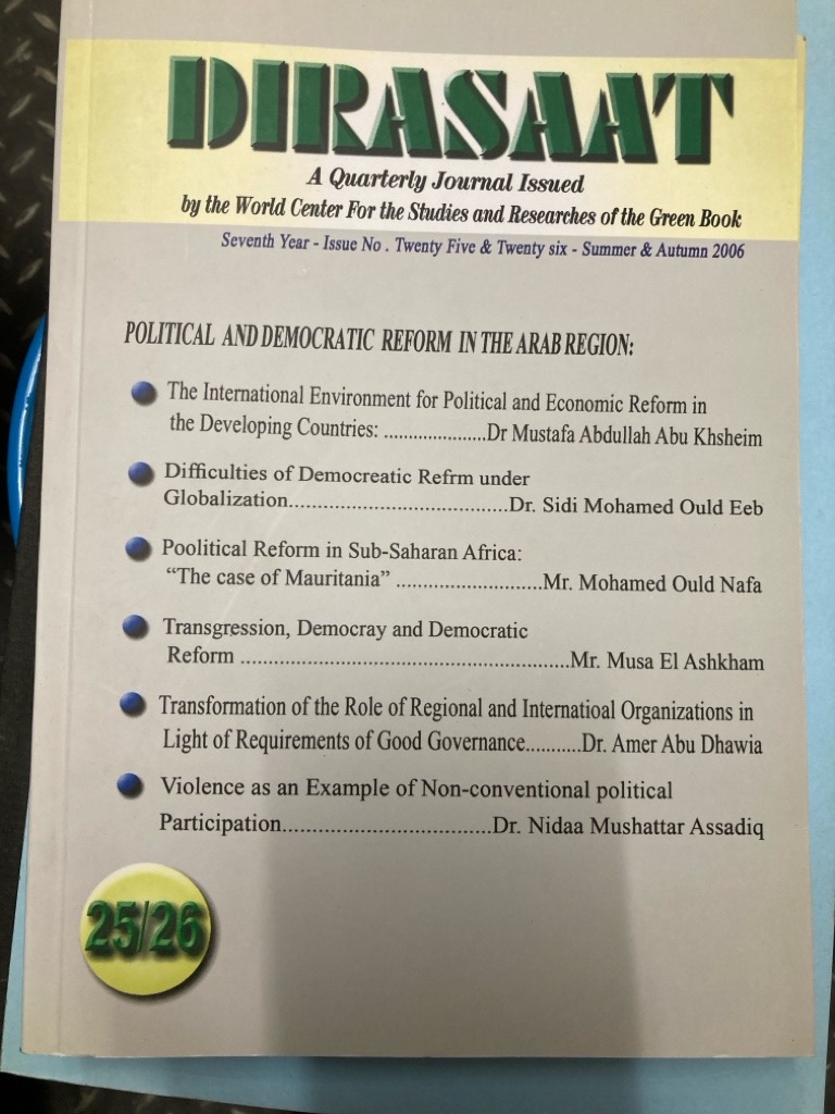 Publisher: Tripoli: Dirasaat 2006. (Dirasaat: A Quarterly Journal Issued by the World Centre for the Studies and Researches of the Green Book)
