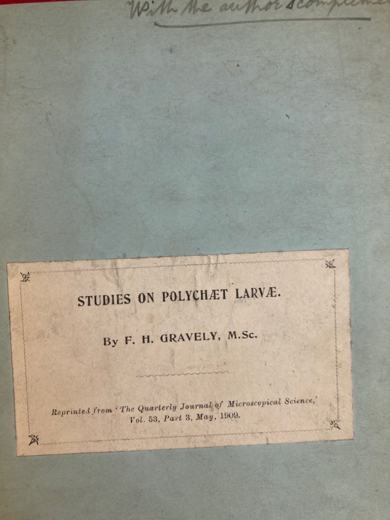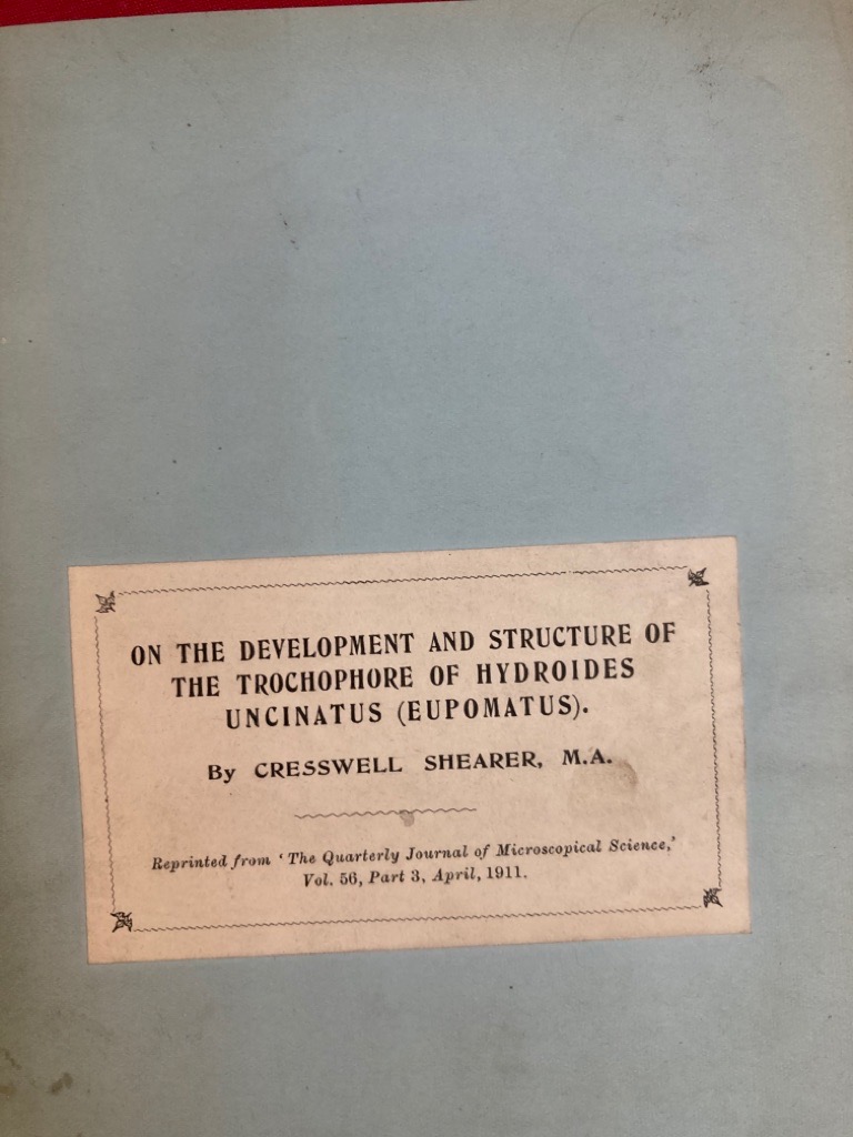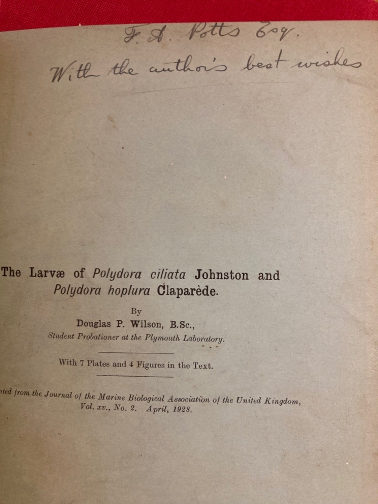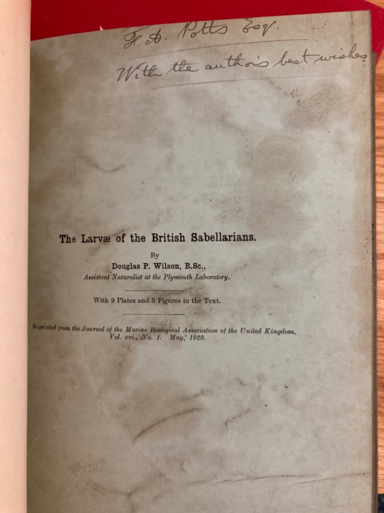 Description: bound collection of offprints, approx 12 offprints, large format, green cloth, to spine lettered Polychaet Larvae. Papers by F H Gravely (1x) (1909), Cresswell Shearer (1x) (1911) on Trochophore of Hydroides Uncinatus; Douglas Wilson (approx 10 papers) (1928) on Loimia Medusa Sav; on Polydora Ciliata and Polydora Hoplura (1928); British Sabellarians; Nereis Pelagica; Notomastus Latericeus Sars; Audouinia Tentaculata (Montague); Sabellid Branchiomma Vesiculosum, etc, most from the journals of Microscopical Science and Marine Biology, most with Author's compliments, inscribed to "Potts", most with interesting illustrations and plates. Unique and rare item, very well preserved